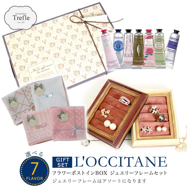 女性に人気のロクシタンのハンドクリーム(30ml)とジュエリーフレーム、タオルチーフをフラワーポストインボックスにセットしたギフトセットです。