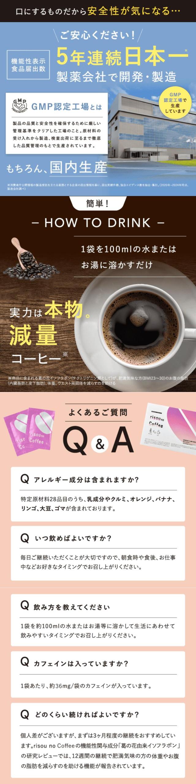 | 原材料(りそうのこーひー) | コーヒーパウダー(ブラジル製造)、難消化性デキストリン(水溶性食物繊維)、デキストリン、葛の花抽出物、植物発酵抽出物(オレンジ・バナナ・リンゴ・クルミ・大豆・ゴマを含む)、赤ワイン抽出物、殺菌乳酸菌混合末(乳成分を含む)、粉末油脂、黒ショウガ抽出物/炭末色素、シクロデキストリン ※特定原材料28品目のうち、乳成分、オレンジ、バナナ、リンゴ、クルミ、大豆、ゴマが含まれております。 |