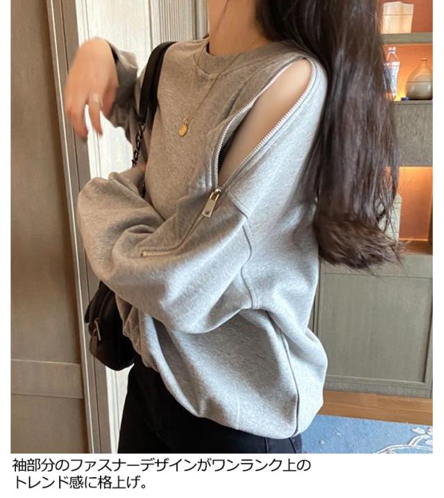 トレンド感たっぷり!袖ファスナー スウエット 送料無料 トレーナー レディース パーカー プルオーバーパーカー 肩出し 肩だし 個性的 セクシー トップス 春 春服 肩露出 ラウンドネック 秋 秋服 トレンド 女性