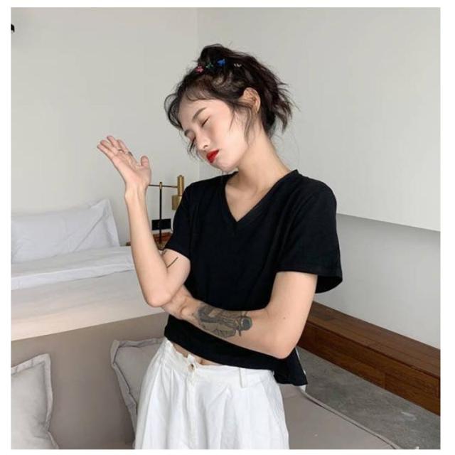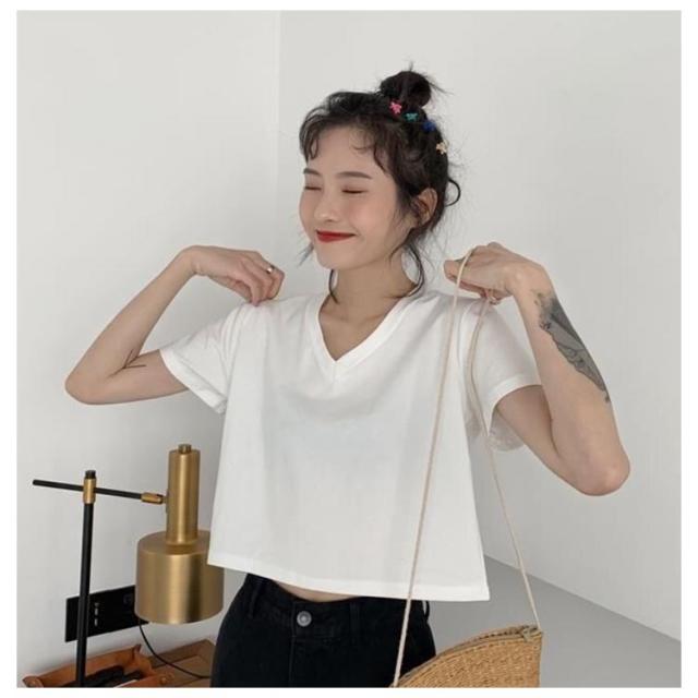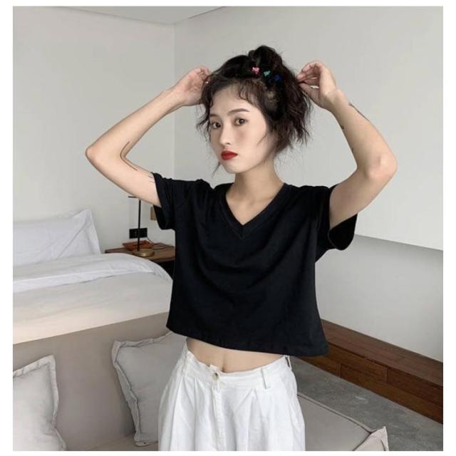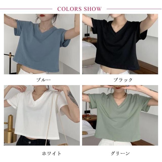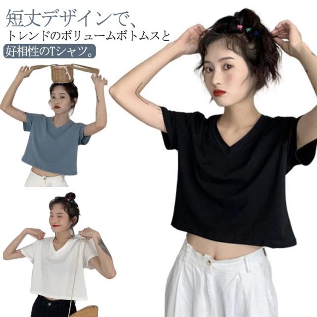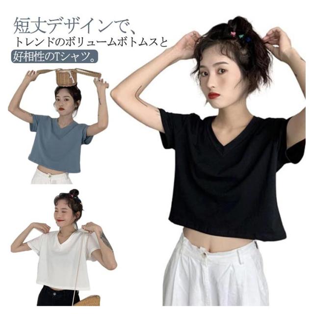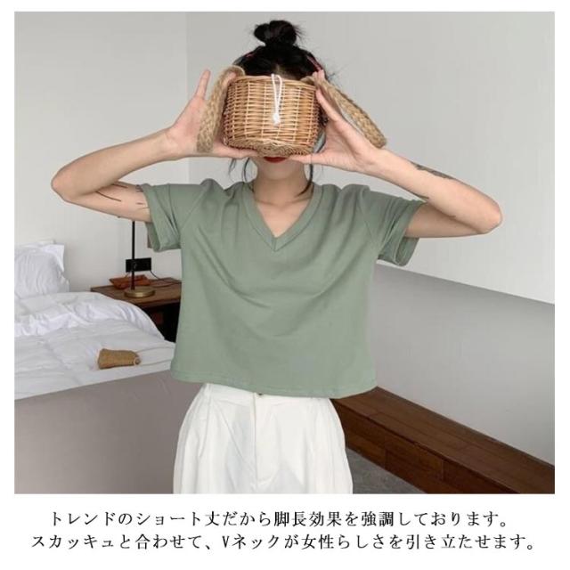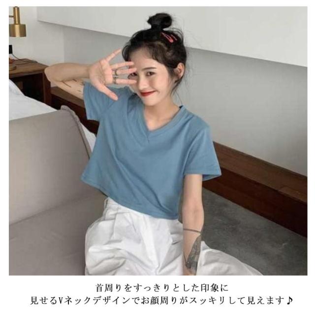 tシャツ ショート丈 レディース カットソー トップス 半袖 無地 インナー シンプル 送料無料 Vネック 半袖tシャツ Vネックtシャツ 半袖 カットソー トップス ショート 無地 ハイウエスト