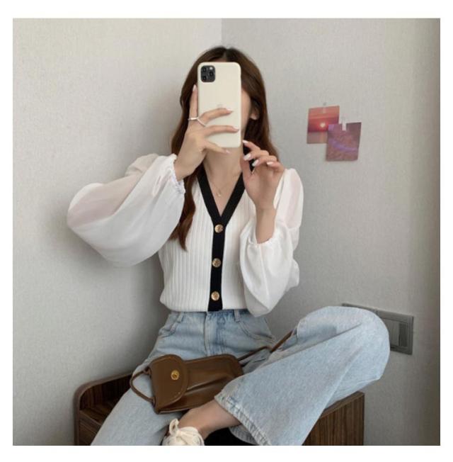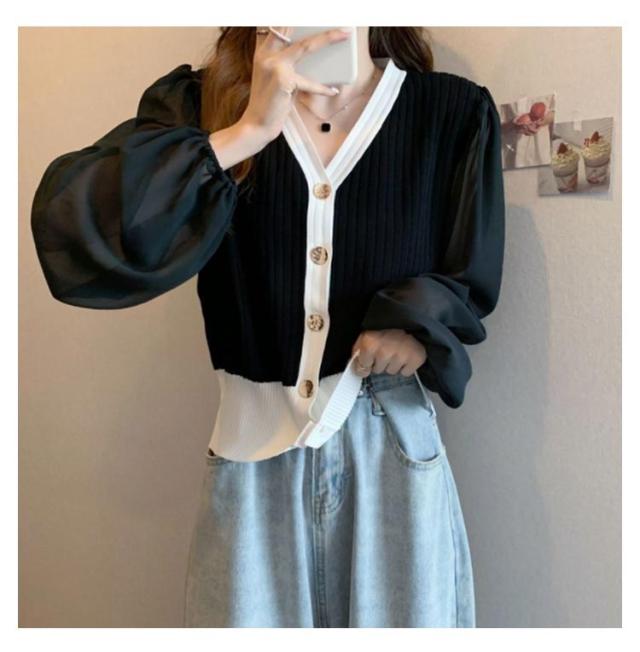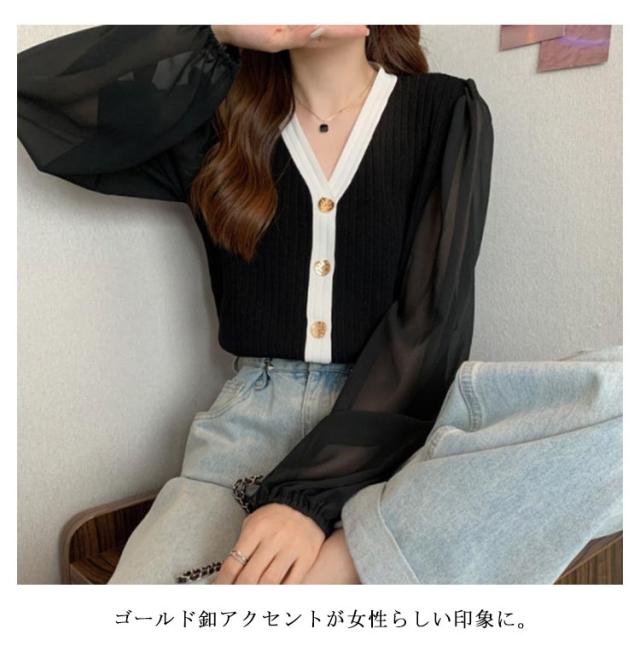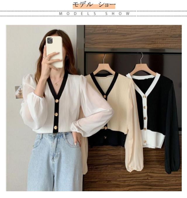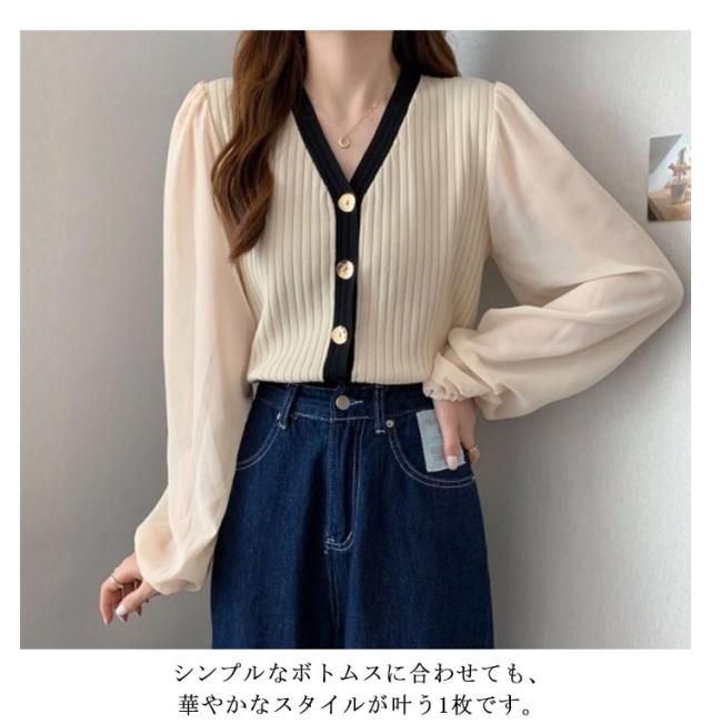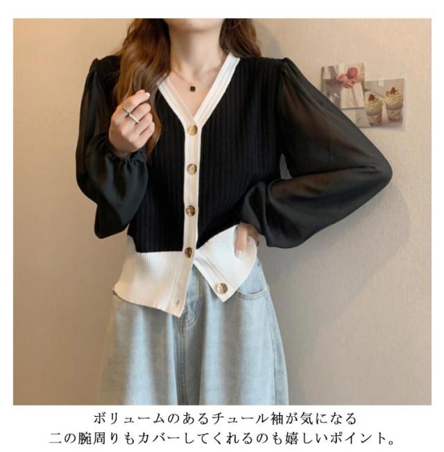 ニットカーディガン レディース 長袖 Vネック カーディガン チュール袖 切り替え バイカラー ボリューム袖 ニットカーデ 春 秋 トップス 羽織り 薄手 大人カジュアル 可愛い フェミニン 無地 春服 秋服 韓国ファッション 送料無料