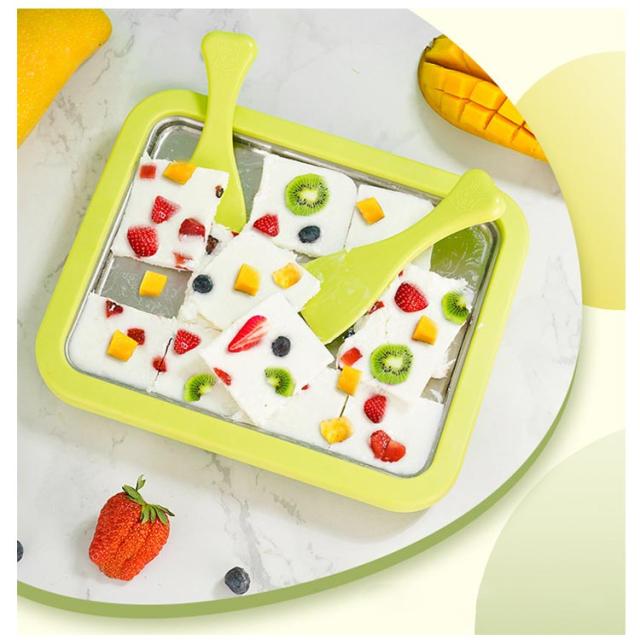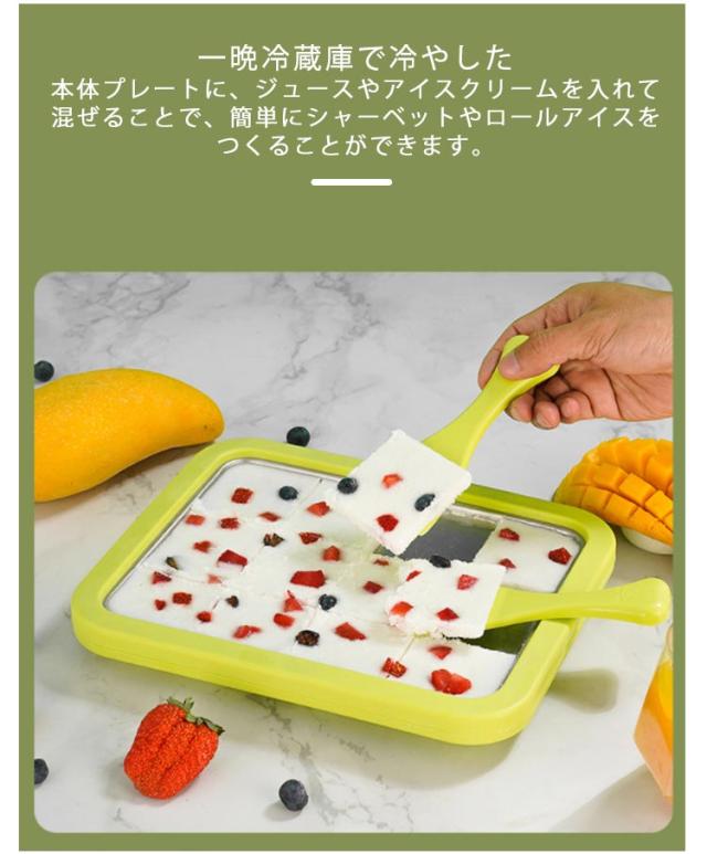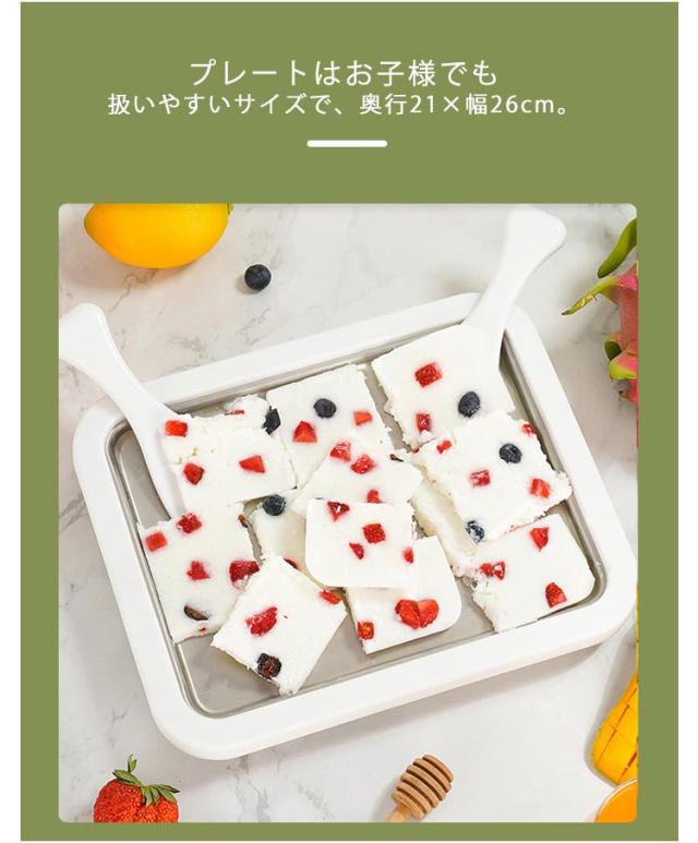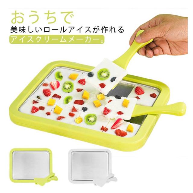 | おうちで美味しいロールアイスが作れるアイスクリームメーカー。 一晩冷蔵庫で冷やした本体プレートに、ジュースやアイスクリームを入れて混ぜることで、簡単にシャーベットやロールアイスをつくることができます。 プレートはお子様でも扱いやすいサイズで、奥行21×幅26cm。 ロールアイスの作り方は、材料のアイスクリームをプレートに流し込んで1〜2分待ち、表面が固まってきたら、付属されているヘラを使ってゆっくりと巻いていくだけ。 ステンレス製で手入れも簡単! | |