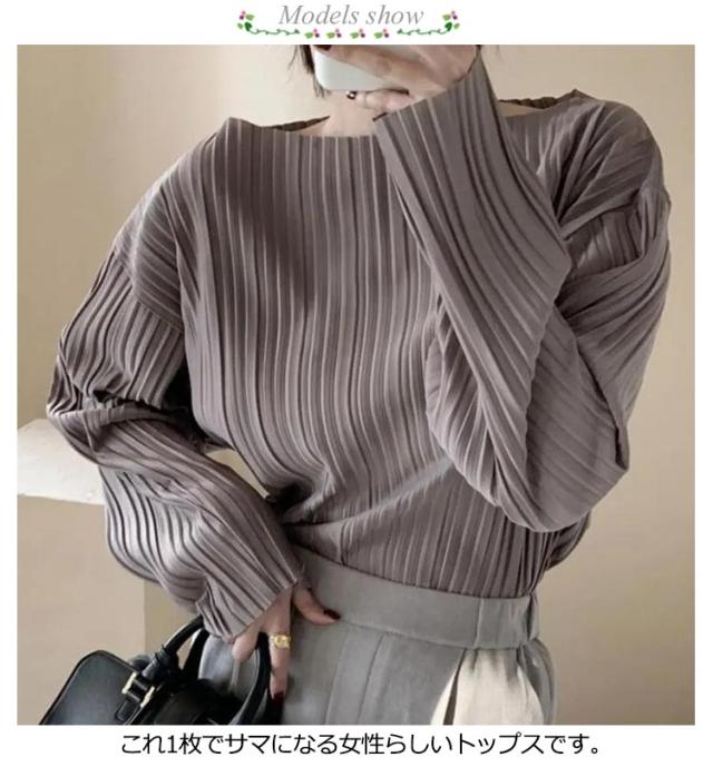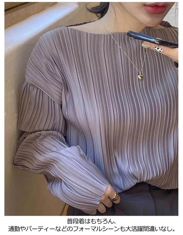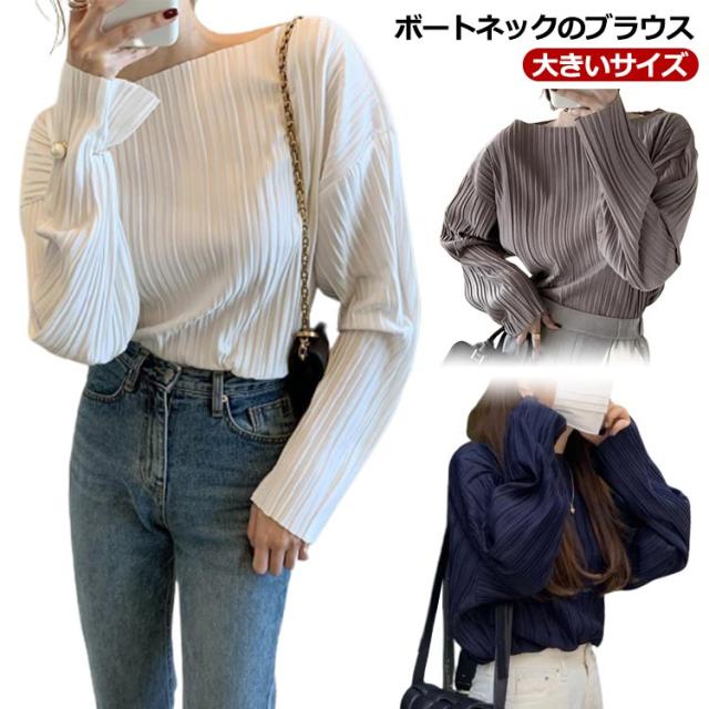 ボートネック シャツ レディース ブラウス プリーツ 長袖シャツ トップス シャツブラウス tシャツ シンプル きれいめ 大きいサイズ 春 秋 ゆったり 上品 大人カジュアル S M L XL 2XL 3XL