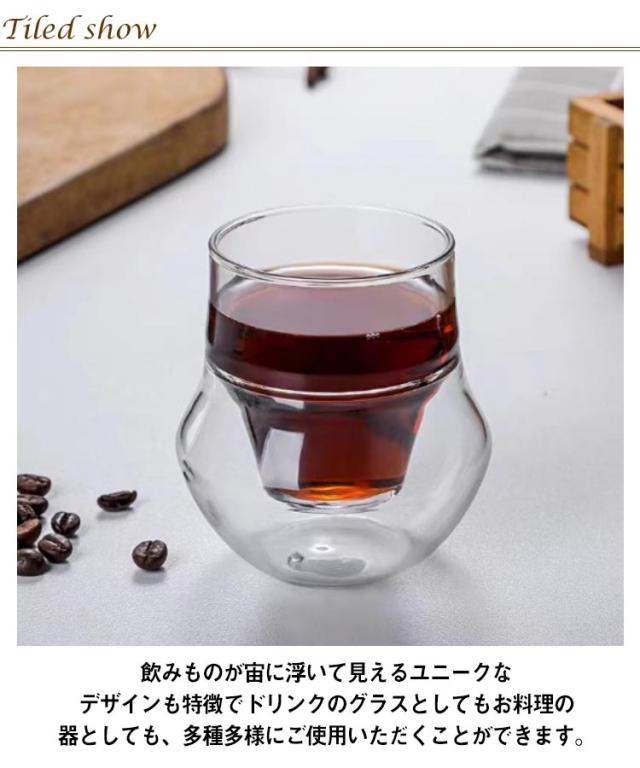 | 飲みものが宙に浮いて見えるユニークなデザインも特徴でドリンクのグラスとしてもお料理の器としても、多種多様にご使用いただくことができます。 耐熱ガラスの二重構造で、温かい飲みものは温かく、冷たい飲みものは冷たいまま、飲みもののおいしさを持続させる、保温性、保冷性に優れたグラスです。 また、温かい飲みものを入れても熱くて持てないということや、冷たい飲みものを入れても結露しにくいので、グラスやテーブルが濡れるということがありません。 記念日・結婚式・引越し・新築祝い・記念日の贈り物・キッチン用品・食器ギフトです! | |
