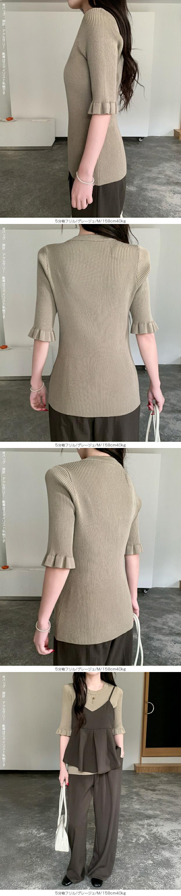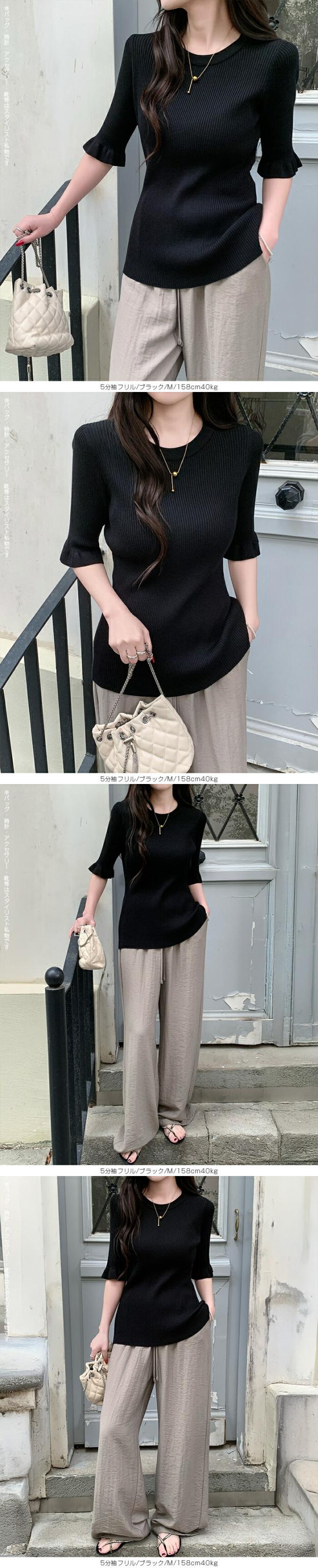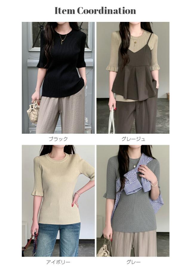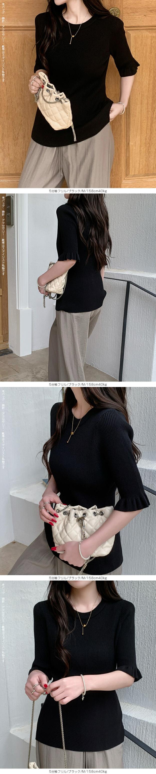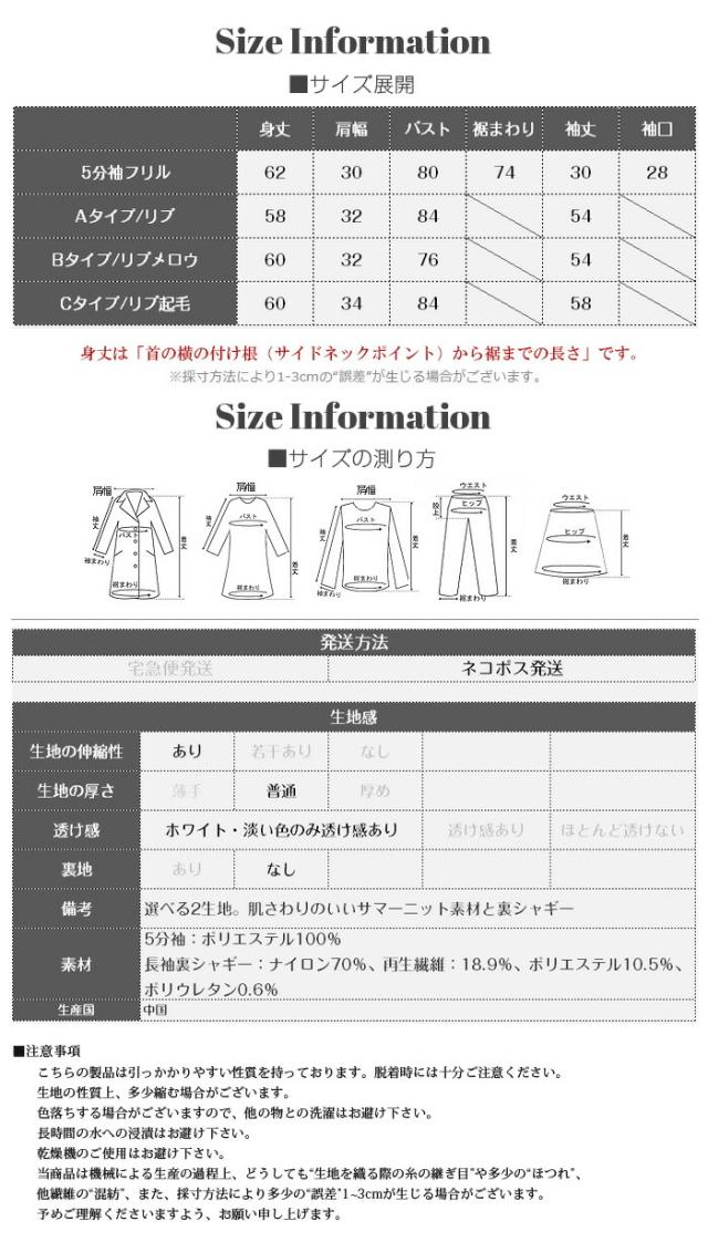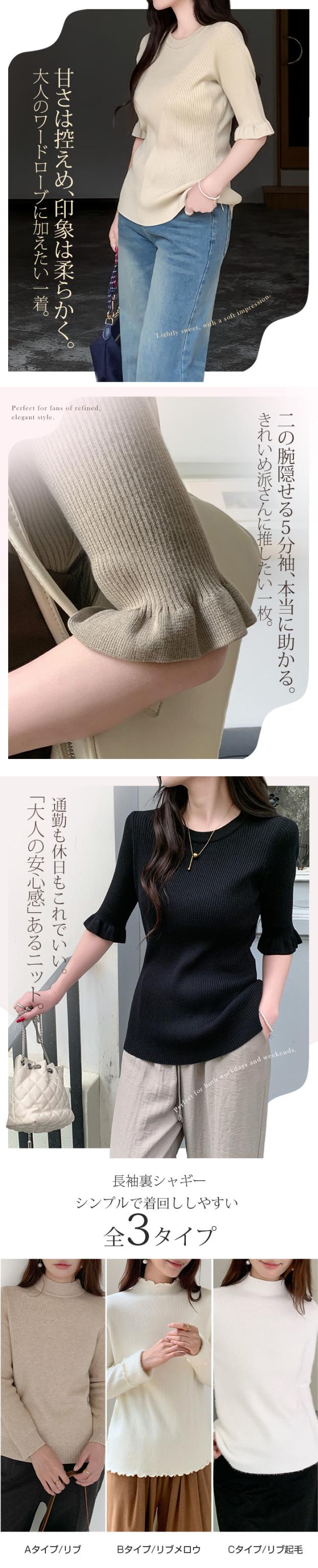 【 選べる2生地 きれいめリブニット 】 ほどよいフィット感で女性らしいラインをきれいに引き立てる、リブニット。 縦ラインを強調するリブ編みがすっきりとした印象を演出し、 幅広いシーンで着用頂ける、デイリーアイテムです。 [5分袖フリル] シンプルながらも袖口のフリルがさりげない華やかさをプラスします。 さらりとした軽やかな素材感で、春夏シーズンに心地よく着用可能。 一枚着としてはもちろん、キャミワンピやビスチェとのレイヤードにも活躍する着回し力の高いトップスです。 [長袖裏シャギー] 高い保温性の裏シャギーと、リブニットをドッキングさせた優秀デザイン。 1枚でヒートインナーの役目も果たしてくれるから、冬の着膨れも心配なし! 3タイプデザイン展開でお気に入りのデザインからお選びいただけます。 ベーシックカラー展開で、通勤・お出かけ・デイリーコーデまで幅広く対応します。 《商品ポイント》 ・身体にフィットしすぎない程よい伸縮性 ・一枚でもレイヤードでも使える万能トップス [5分袖フリル] ・二の腕をやさしくカバーする5分袖丈 ・袖口フリルで程よいフェミニンさをプラス ・春夏に嬉しい軽やかなサマーニット素材 [長袖裏シャギー] 裏シャギー仕様で1枚でしっかり保温。 着膨れしにくく、寒さの気になる初春にも活躍してくれる1着。 ・縦ラインを強調する細リブ編みでスタイルアップ見え 《デザイン・シルエット》 [5分袖フリル] ・ネック:ベーシックなクルーネックで上品な印象 ・編地:細リブで縦ラインを強調 ・袖:5分袖+控えめフリルで女性らしいアクセント ・シルエット:ウエストラインを自然に沿うすっきりフォルム ・丈感:ボトムイン・アウトどちらもバランス良く決まる着丈 [長袖裏シャギー] Aタイプ/リブ ・シンプルなモックネックデザイン。 ・ネック/袖リブでスッキリとした印象。 Bタイプ/リブメロウ ・ハイネックデザインでネックと袖がメロウフリル。 ・シンプルの中に可愛さも光るデザイン。 Cタイプ/リブ起毛 ・表地に起毛感のあるデザインで柔らかい印象に。 身体のラインを拾いすぎない設計で、きれいめにもカジュアルにも対応できる万能バランスです。 《コーディネート提案》 ■デニム合わせで大人カジュアル 細身デニムやストレートパンツと合わせて、シンプルながら上品なデイリーコーデに。 ■ワイドパンツで抜け感スタイル 落ち感のあるワイドパンツと合わせれば、縦ラインが強調されバランス良く仕上がります。 ■キャミワンピ・ビスチェとレイヤード トレンドのレイヤードスタイルにも好相性。袖フリルが程よいアクセントになります。 ■通勤コーデにも テーパードパンツやきれいめスカートと合わせて、オフィスカジュアルにも対応。 《サイズ・カラーバリエーション》 サイズ:FREE カラー:5分袖フリル…ブラック / アイボリー / グレージュ / グレー 長袖裏シャギーAタイプ/リブ…モカ / ホワイト / ブラック 長袖裏シャギーBタイプ/リブメロウ…モカ / ホワイト / ブラック / ベージュ 長袖裏シャギーCタイプ/リブ起毛…モカ / ホワイト / ブラック / ベージュ 《素材・機能性》 ・素材:5分袖:ポリエステル100% 長袖裏シャギー:ナイロン70%、再生繊維:18.9%、ポリエステル10.5%、ポリウレタン0.6% ・透け感:5分袖…ホワイト・淡い色のみ透け感あり 長袖裏シャギー…なし ・伸縮性:あり ・厚み:5分袖…薄手 長袖裏シャギー…普通 |