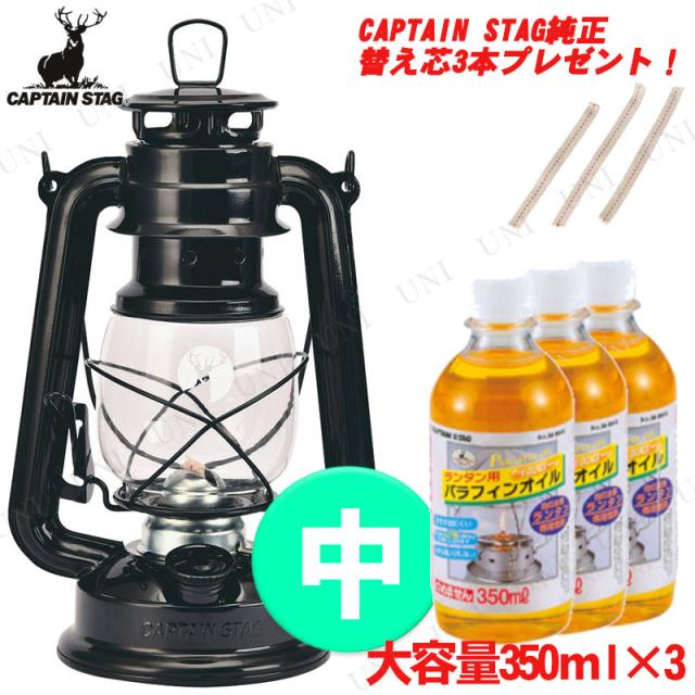 [2点セット+プレゼント] CAPTAIN STAG(キャプテンスタッグ) オイルランタン〈中〉(ブラック) UK-508・パラフィンオイル350mL(3本)・純正替え芯(3本組) 【 液体燃料 アウトドア用品 屋外 キャンプ用品 灯り ライト 野外 レジャー用品 ランプ 】