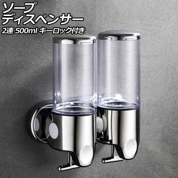 ソープディスペンサー 2連 クリア ABS&ステンレス製 500ml 壁掛け式 手動 キーロック付き 片手で使えるレバー式!狭いスペースでも設置可能 AP-UJ0937-2S-CL