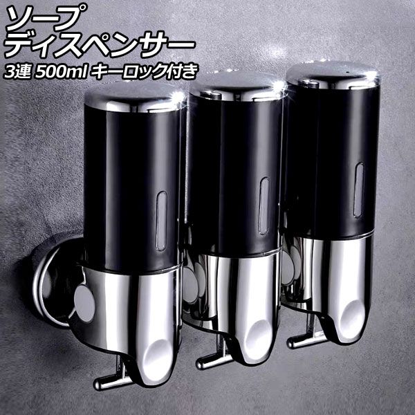 ソープディスペンサー 3連 ブラック ABS&ステンレス製 500ml 壁掛け式 手動 キーロック付き 片手で使えるレバー式!狭いスペースでも設置可能 AP-UJ0937-3S-BK