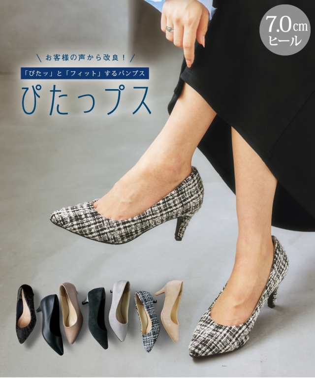 お客様の声から生まれた、かかとに「ぴたっ」と「フィット」する【ぴたっプス】シリーズの7 ヒールタイプ。どこから眺めても美しいシルエット、さらに履き心地にも磨きをかけた一品です。お客様のお声を元に、ヒール先のリフトの品質を改善しました。 ■デザイン ・女性らしいシルエットをお求めの方。すっきりとした足元を演出したい方。長めのパンツを履かれる方におすすめのヒール高7cm。・お客様のお声を元に、ヒール先のリフトの品質を改善しました。・つま先を反り上げることで、踏み込んだ時のかかとの浮きを抑制。・かかとのクッシ