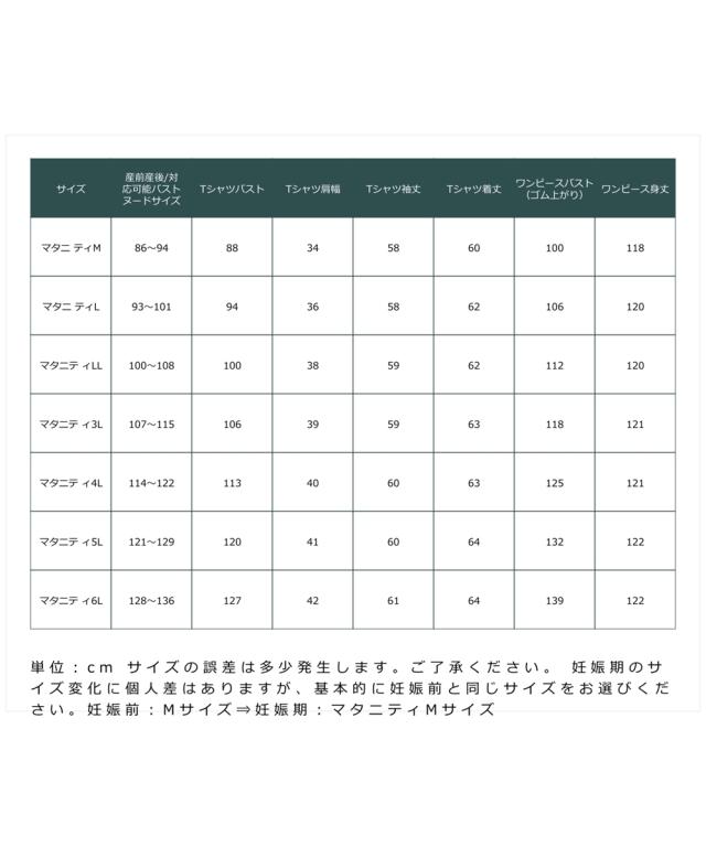 品質:[Tシャツ]ポリエステル65%・綿35%(カットソー)[ワンピース]ポリエステル65%・綿35%(織物) 透け感:やや透ける( 淡色 ) ※色によって透け感が異なる場合があります。淡色カラーはベージュインナーの着用をおすすめします。 伸縮性:[Tシャツ]ややあり[ワンピース]なし 生地の厚み:普通 裏地:なし ポケット:[ワンピース]あり(両脇) シルエット:普通 柄の出方が多少異なる場合があります。 原産国:中国製 備考:洗濯機OK(ネット使用) 単位:cm ※サイズの誤差は多少発生します。ご了承ください。 ※妊娠期のサイズ変化に個人差はありますが、基本的に妊娠前と同じサイズをお選びください。 妊娠前:Mサイズ⇒妊娠期:マタニティMサイズ