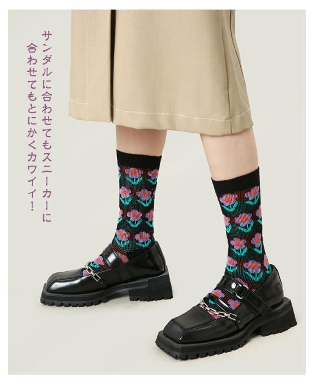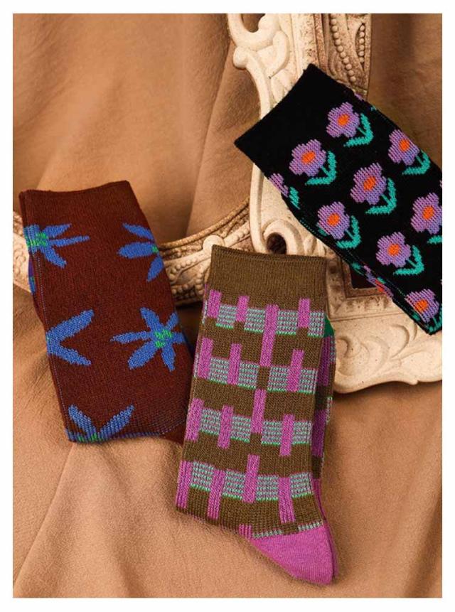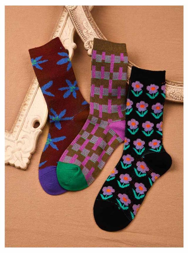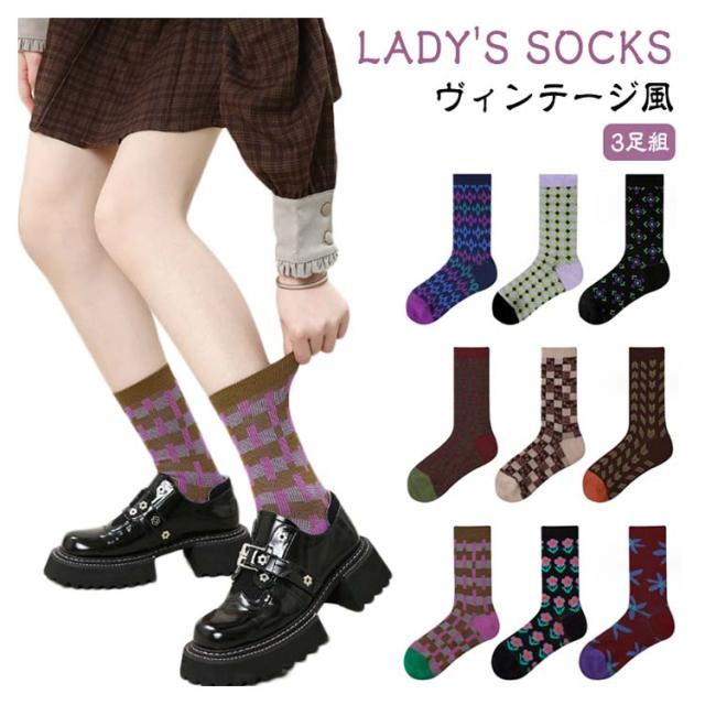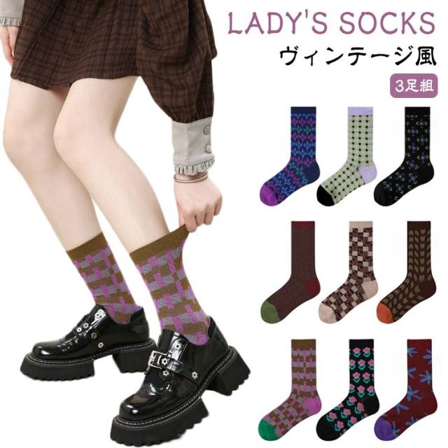 おしゃれ ソックス ボーダー柄 花柄 靴下 ミドル丈 秋色 チェック柄 靴下 3足セット レディース チェック 靴下 スニーカーソックス クルー丈 クルーソックス 北欧 ソックス くつした ヴィンテージ風 靴下 送料無料
