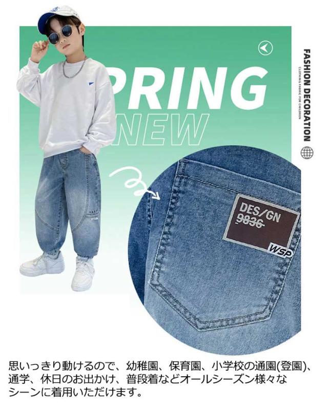 | 定番人気の子供デニムパンツ。 柔らかめの生地で肌触り良く、ウエストはゴムで伸縮性があり、着やすさ抜群! 腰回りはゆるりとしたデザインなのでかっこいいのにゆったり楽ちんなのも魅力です。 思いっきり動けるので、幼稚園、保育園、小学校の通園(登園)、通学、休日のお出かけ、普段着などオールシーズン様々なシーンに着用いただけます。 ダンス等の発表会衣装にもよく利用され、ヒップホップ系からポップスタイルまで大人顔負けの子供スタイルの完成♪ | |
