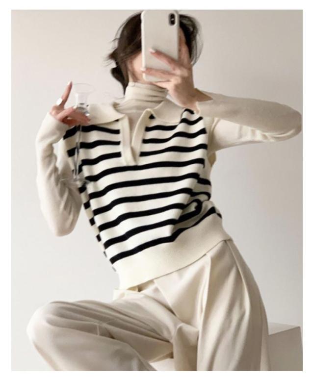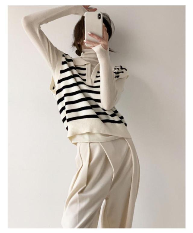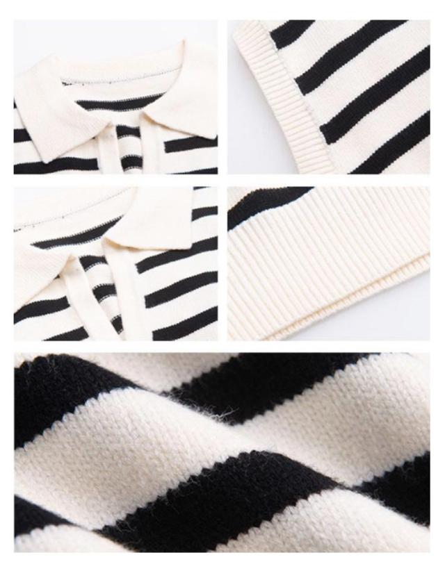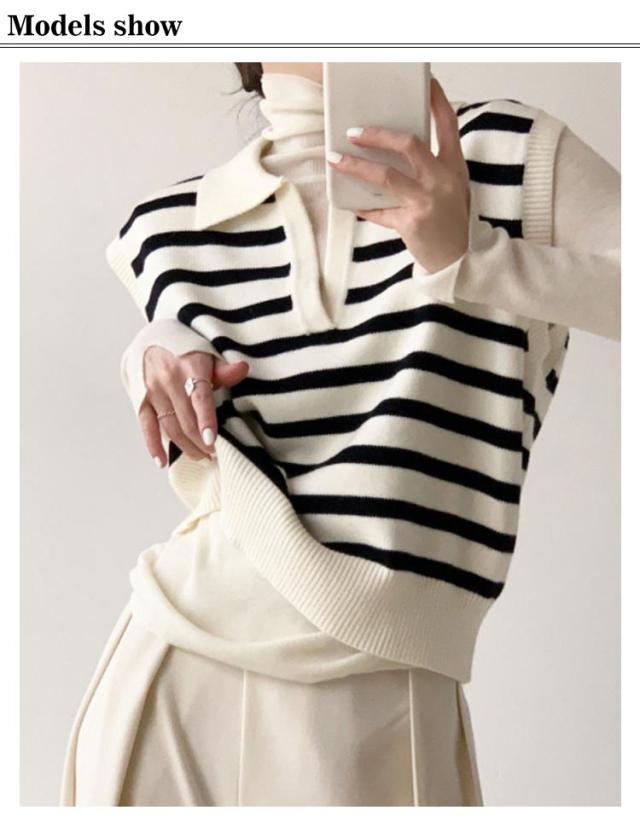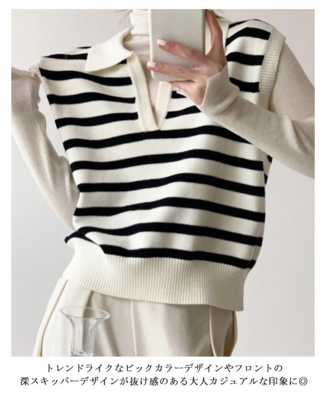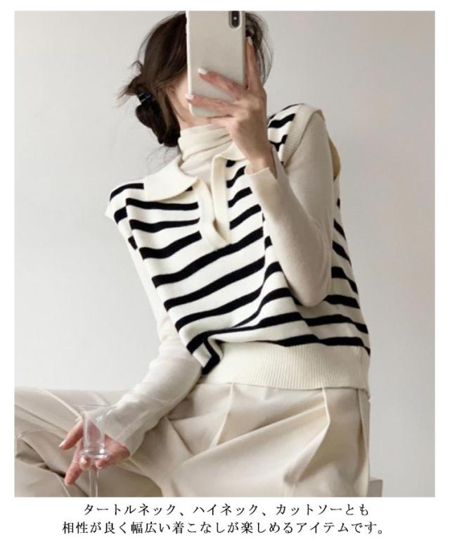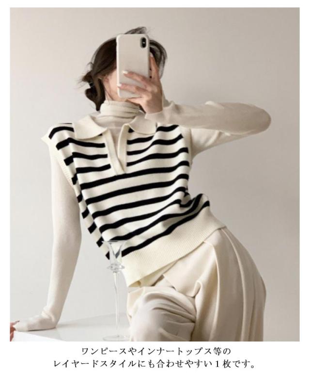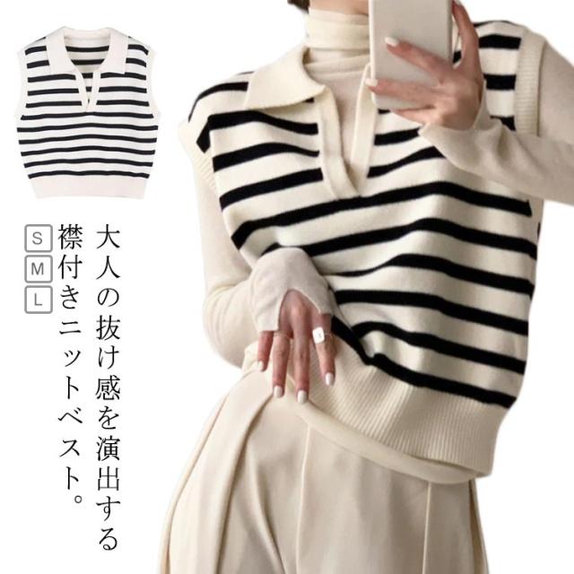 襟付き ニットベスト スキッパー ノースリーブ セーター ボーダー レディース 重ね着 韓国ファッション ポロカラー ニット ベスト ジレ 春秋 冬 20代 30代 40代 レイヤード 体型カバー Vネック