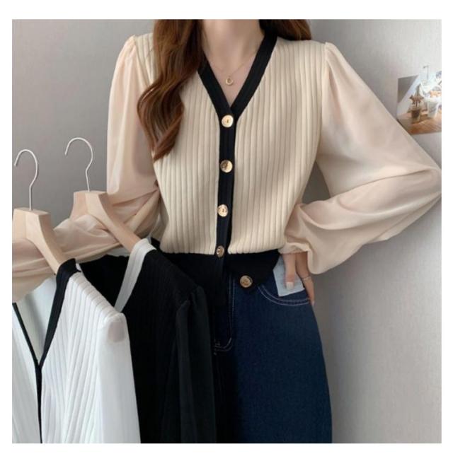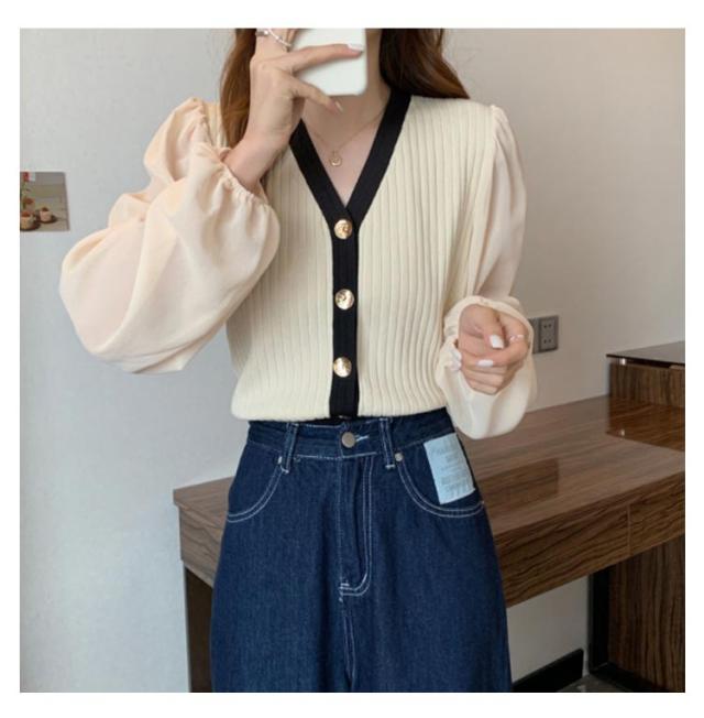 ニットカーディガン レディース 長袖 Vネック カーディガン チュール袖 切り替え バイカラー ボリューム袖 ニットカーデ 春 秋 トップス 羽織り 薄手 大人カジュアル 可愛い フェミニン 無地 春服 秋服 韓国ファッション 送料無料