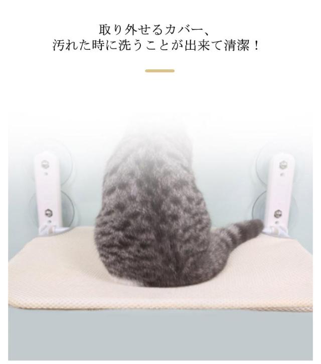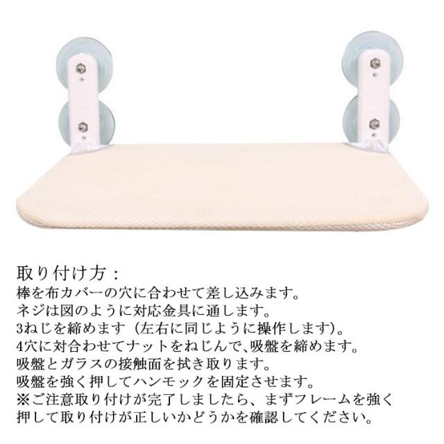 | 日光浴、休憩時間、遊びなどにぴったり、猫ちゃんともっと楽しく遊べる! 高いところが大好きな猫ちゃんに設計した、吸盤タイプ式猫窓用ハンモック。 耐久性に優れた強力な吸盤が4つ付きで、耐荷重最大12KG、安定性に優れ、大きい猫ちゃんも安心に使えます。 不要な時に折りたたむことが出来、窓、カーテンのスペースに邪魔せずに、とても便利! 取り外せるカバー、汚れた時に洗うことが出来て清潔! 吸盤で取り付け簡単、高さ調節が可能!窓ガラスに強力吸盤をぴたっと貼り付けるだけで簡単に組み立てできる。窓ガラスを傷つけないように! 吸盤式なので、猫ちゃんの成長に合わせて装着する高さを簡単に変えられ、窓や壁を破る必要はないです。 付属品:マット*1、曲がったパイプ*1、パイプ*1 固定スタンド*2、吸盤*4、ナット*4、ネジ*2、レンチ*1 配件。 取り付け方:棒を布カバーの穴に合わせて差し込みます。 ネジは図のように対応金具に通します。 3ねじを締めます(左右に同じように操作します)。 4穴に対合わせてナットをねじんで、吸盤を締めます。 吸盤とガラスの接触面を拭き取ります。 吸盤を強く押してハンモックを固定させます。 ※ご注意取り付けが完了しましたら、まずフレームを強く押して取り付けが正しいかどうかを確認してください。 | |