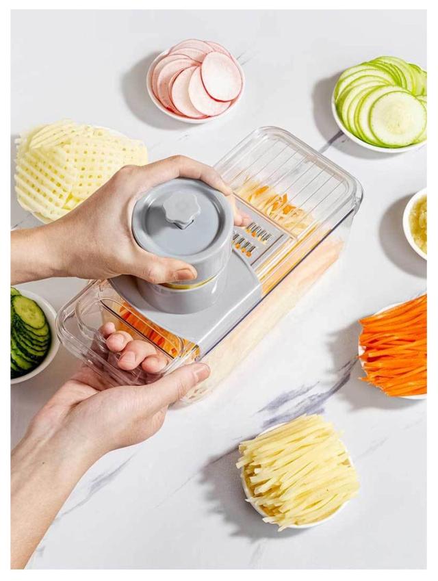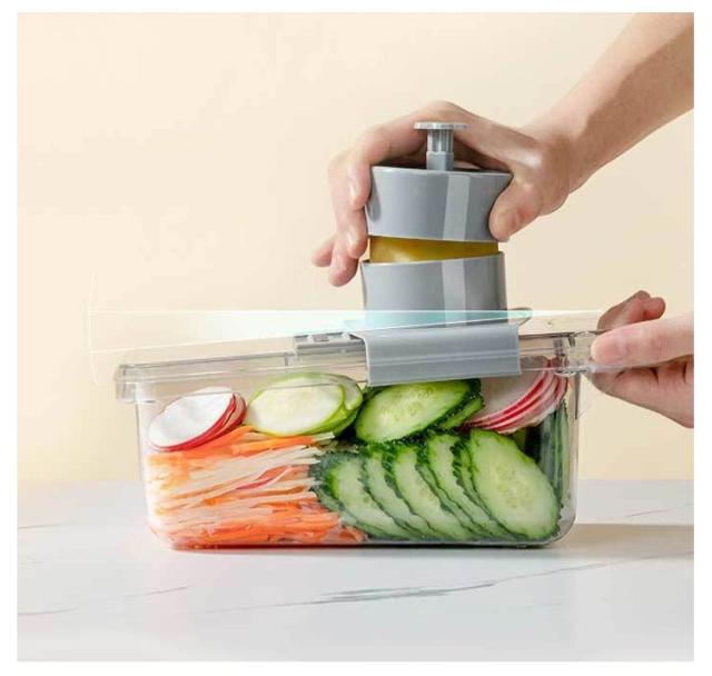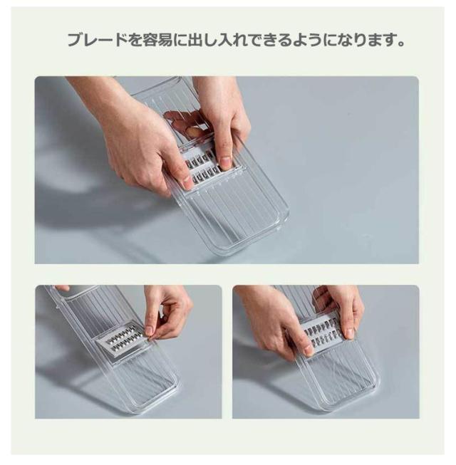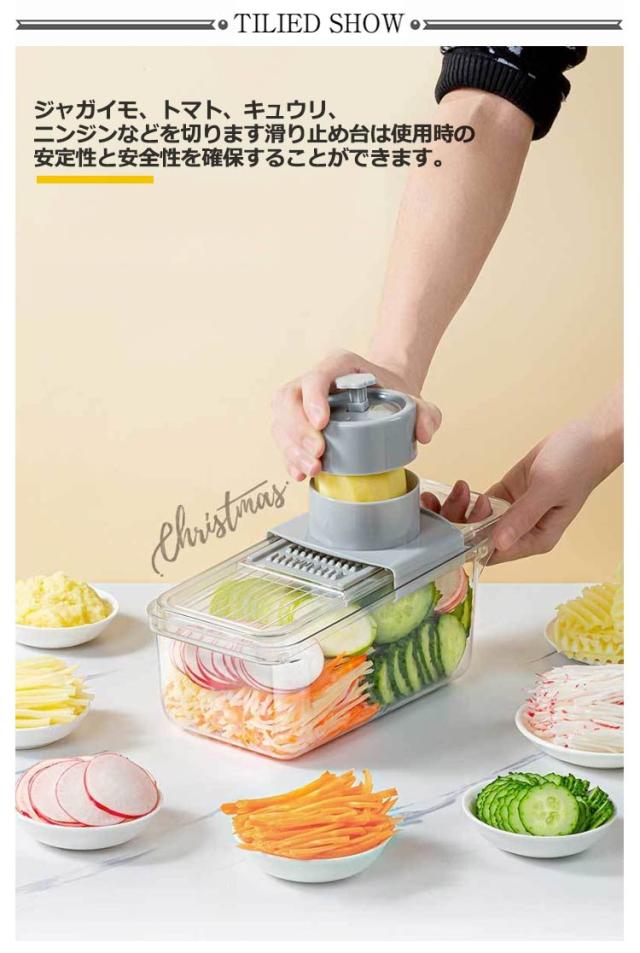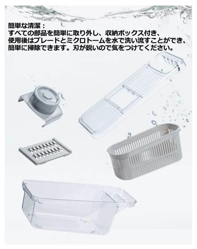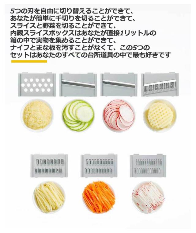 | 簡単に食べ物を理想的な形や大きさに切ることができます。 ブレードを容易に出し入れできるようになります。 ジャガイモ、トマト、キュウリ、ニンジンなどを切ります滑り止め台は使用時の安定性と安全性を確保することができます。 5つの刃を自由に切り替えることができて、あなたが簡単に千切りを切ることができて、スライスと野菜を切ることができて、内蔵スライスボックスはあなたが直接1リットルの箱の中で実物を集めることができて、ナイフとまな板を汚すことがなくて、この5つのセットはあなたのすべての台所道具の中で最も好きです 簡単な清潔:すべての部品を簡単に取り外し、収納ボックス付き、使用後はブレードとミクロトームを水で洗い流すことができ、簡単に掃除できます。刃が鋭いので気をつけてください。 | |