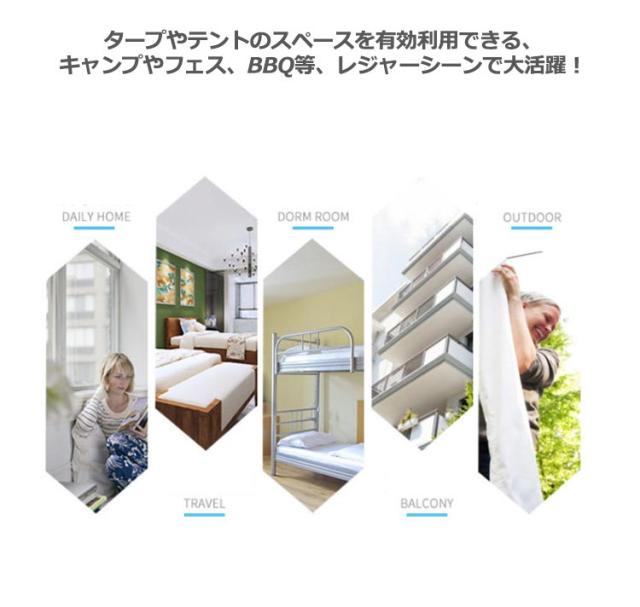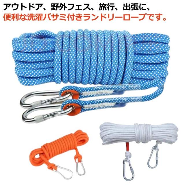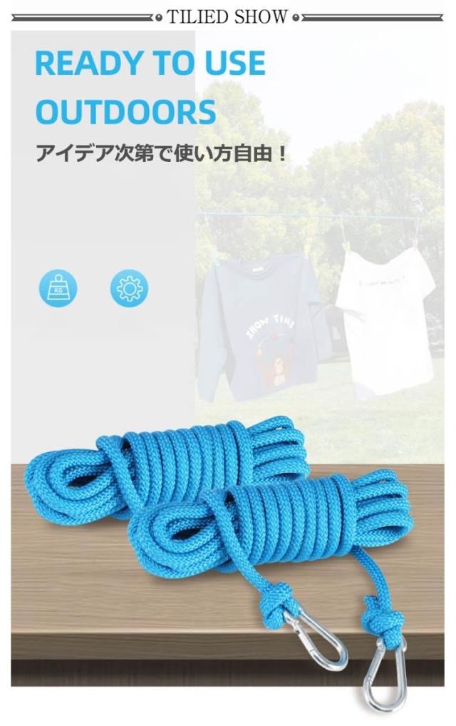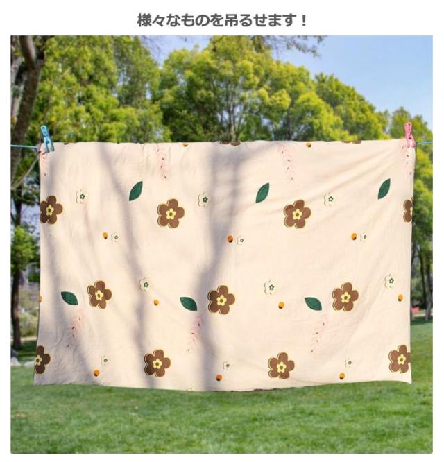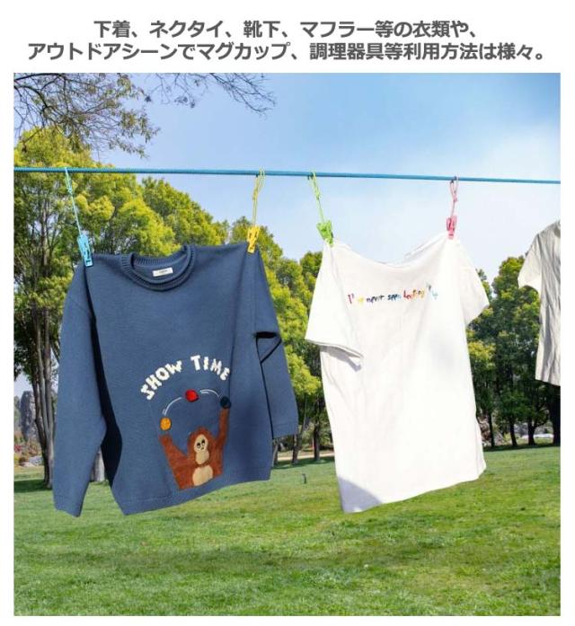 | アウトドア、野外フェス、旅行、出張に、便利な洗濯バサミ付きランドリーロープです。 アイデア次第で使い方自由! タープやテントのスペースを有効利用できる、キャンプやフェス、BBQ等、レジャーシーンで大活躍! 様々なものを吊るせます! 下着、ネクタイ、靴下、マフラー等の衣類や、アウトドアシーンでマグカップ、調理器具等利用方法は様々。 | |
