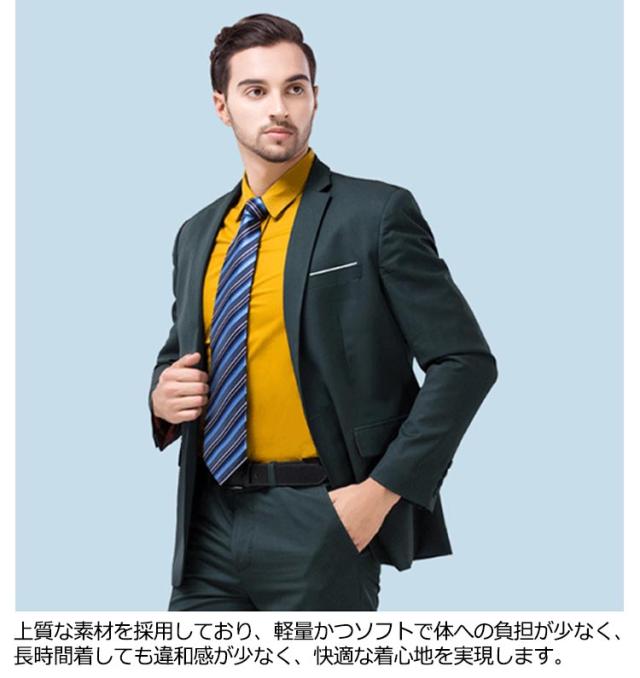 | 2点セット:ジャケット+ズボン ビジネスからパーティーシーンまで、こだわり のトレンドスタイルで大人の男をスタイリッシュに彩るスーツ。 上質な素材を採用しており、軽量かつソフトで体への負担が少なく、長時間着しても違和感が少なく、快適な着心地を実現します。 ジャケットはウエストラインを強調させたスラ ント仕様で、パンツは太ももから裾にかけてのラインがス マートな印象で、足を長くスッキリと見せる細めの美脚シルエット。 エレガントラグジュアリーな雰囲気を醸して、 お勧めの一着となります。 場合:結婚式、宴会、成人の日、通勤、旅行、 カジュアル、日常、デート。 | |