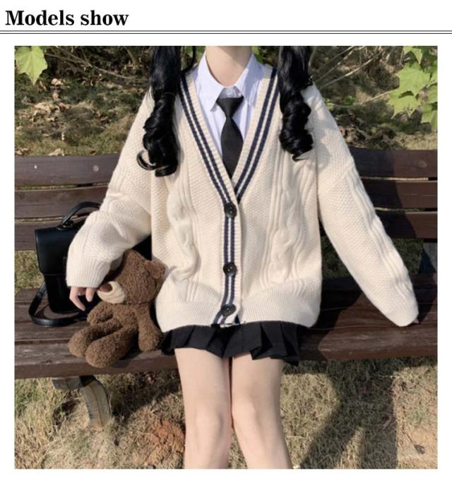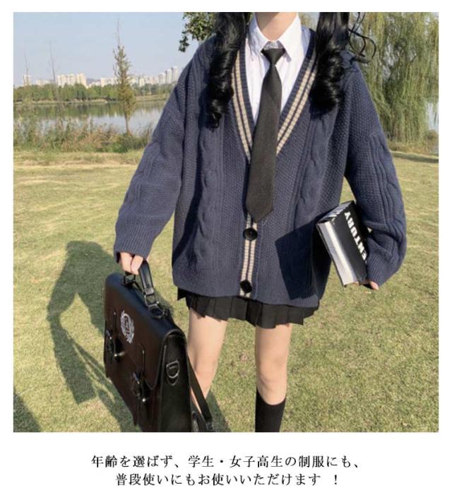 スクールカーディガン ニット ケーブル編み カーディガン 学生 ゆったり Vネック ニット ライン入り スクールセーター 秋冬 厚手 JK制服 学生服 女子 学校 高校生 通学 コスプレ レディース