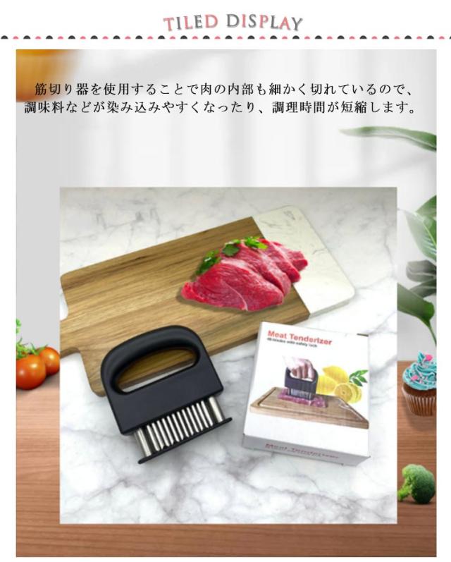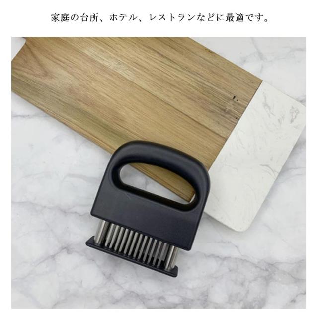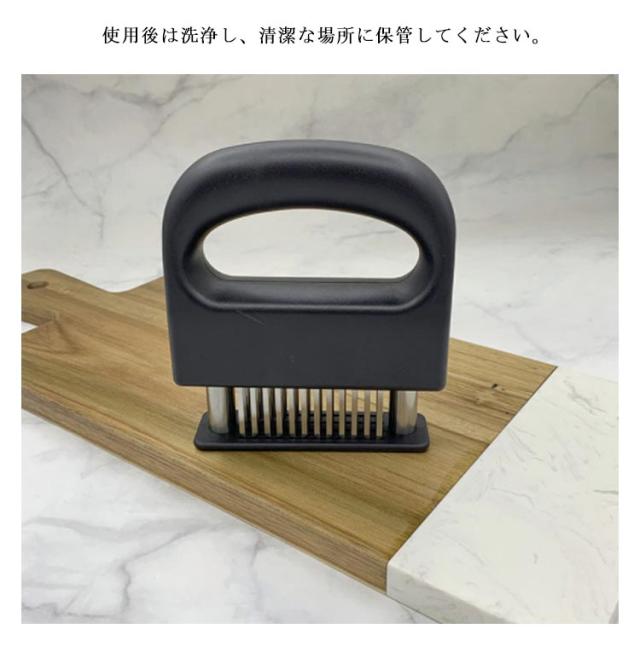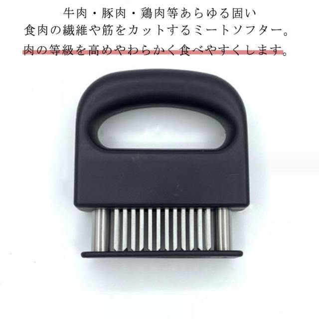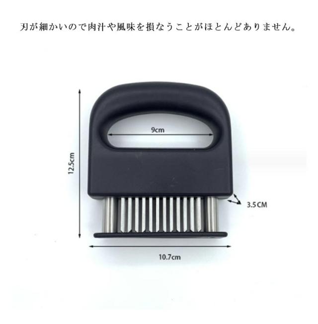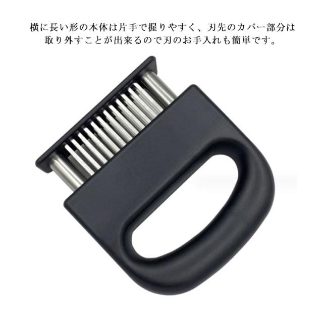 | 牛肉・豚肉・鶏肉等あらゆる固い食肉の繊維や筋をカットするミートソフター。肉の等級を高めやわらかく食べやすくします。 筋切り器を使用することで肉の内部も細かく切れているので、調味料などが染み込みやすくなったり、調理時間が短縮します。 刃が細かいので肉汁や風味を損なうことがほとんどありません。 横に長い形の本体は片手で握りやすく、刃先のカバー部分は取り外すことが出来るので刃のお手入れも簡単です。 家庭の台所、ホテル、レストランなどに最適です。 使用後は洗浄し、清潔な場所に保管してください。 | |