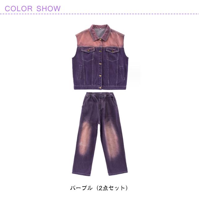 キッズ ダンス衣装 ヒップホップ 紫 デニム ベスト ロングパンツ 絞り染め セットアップ 男の子 女の子 ジャズダンス 袖なし デニムシャツ 長ズボン 2点セット 子供 ジュニア かっこいい ゆったり 団体服 応援団 イベント 発表会 文化祭 演出服 体育祭 120-180cm