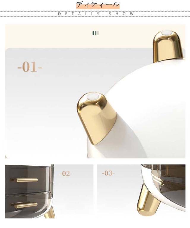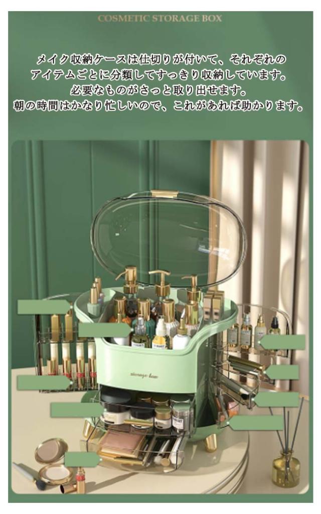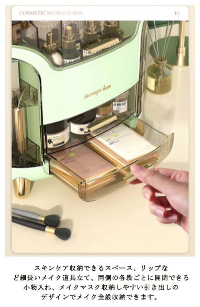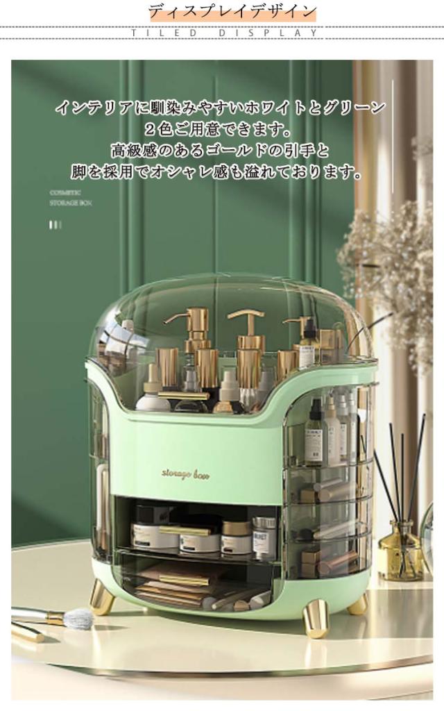 | 【たっぷり収納力】コスメボックスは大容量収納設計で高さ20cmのスキンケアからリップなど細小な物までたっぷり収納できます。一目瞭然で使用しやすいです。 【仕切りが充実】メイク収納ケースは仕切りが付いて、それぞれのアイテムごとに分類してすっきり収納しています。必要なものがさっと取り出せます。朝の時間はかなり忙しいので、これがあれば助かります。 【クリアカバー付き】化粧ボックスは蓋付きで、ホコリやウイルスから化粧品を守ります。サッと拭くだけで汚れがキレイに落ちます。洗面所に置いても使用可能!クリアカバー設計で化粧箱中身をよく見え、ショーケースにもなります。 【こだわりデザイン】スキンケア収納できるスペース、リップなど細長いメイク道具立て、両側の各段ごとに開閉できる小物入れ、メイクマスク収納しやすい引き出しのデザインでメイク全般収納できます。 【おしゃれ】インテリアに馴染みやすいホワイトとグリーン2色ご用意できます。高級感のあるゴールドの引手と脚を採用でオシャレ感も溢れております。 | |