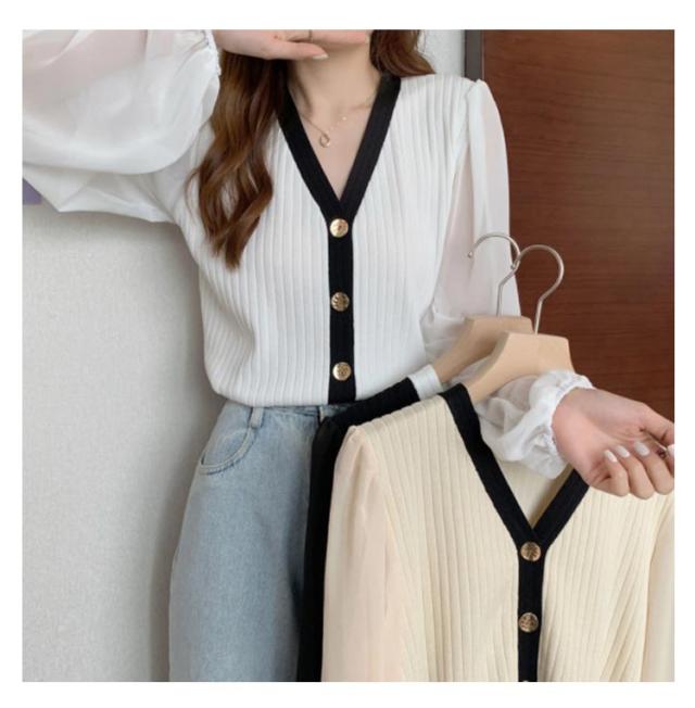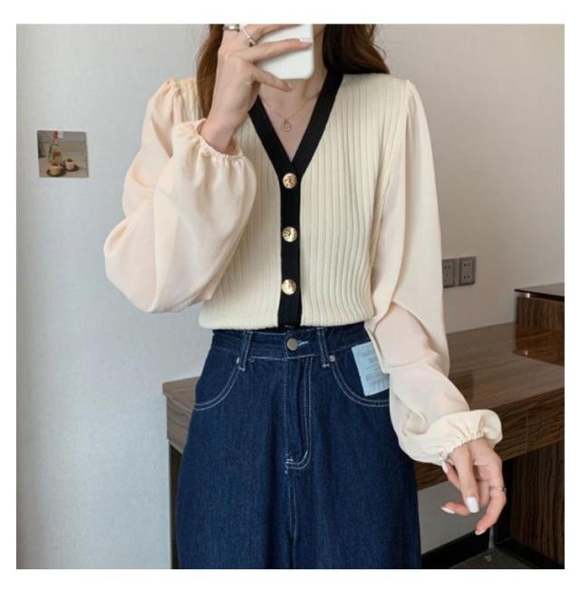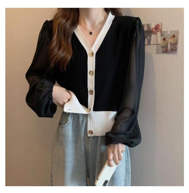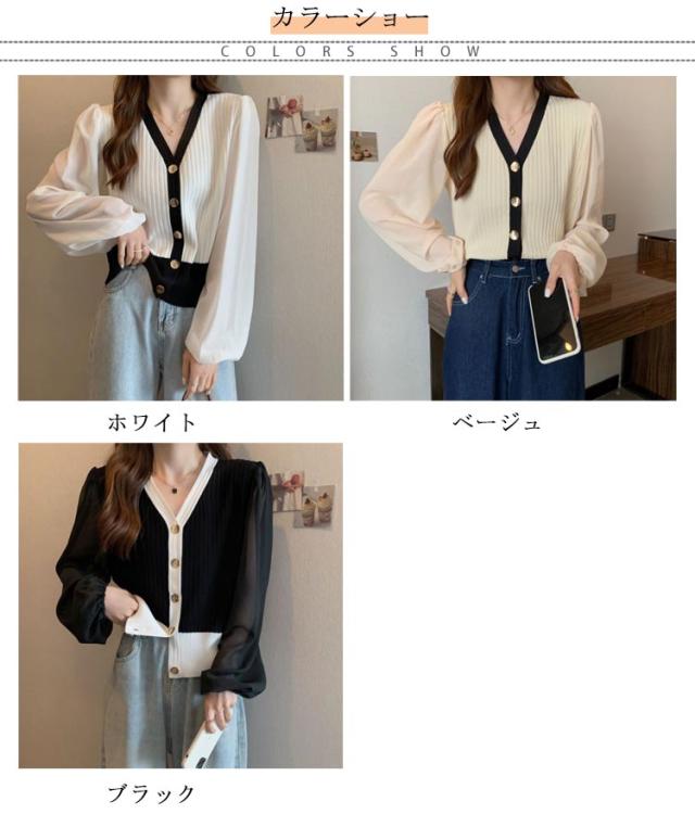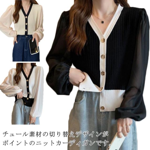 ニットカーディガン レディース 長袖 Vネック カーディガン チュール袖 切り替え バイカラー ボリューム袖 ニットカーデ 春 秋 トップス 羽織り 薄手 大人カジュアル 可愛い フェミニン 無地 春服 秋服 韓国ファッション 送料無料