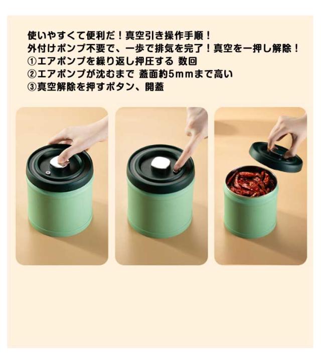 | 【密閉度がより高く】遮光性が良い。軽くて丈夫で高気密、デザインと機能を兼ね備えた保存容器。柔らかいシリコンでしっかり密閉裏蓋四周を覆うによって、空気の通り道が無くなり。湿気を防止することや防水することもできるようになります。おしゃれな酸化や紫外線から守るステンレス製の密封キャニスター。 【収納にぴったり】本容器はコーヒー豆 米びつ ,お茶など食べるものを収納できる。そして、商品の蓋部と底部は、凹凸溝がありますので、重ねても転倒し難いです。 【安全食品グレード材質】食品級の安全素材を採用して、BPAフリー、安心して使えます。フタが取り外せる、洗濯可能。 【持ち運び便利】小型かつ軽量で、持ち運びしやすく、コンパクトで場所にも取りません。 使いやすくて便利だ!真空引き操作手順! 外付けポンプ不要で、一歩で排気を完了!真空を一押し解除! 1.エアポンプを繰り返し押圧する 数回 2.エアポンプが沈むまで 蓋面約5mmまで高い 3.真空解除を押すポタン、開蓋 | |