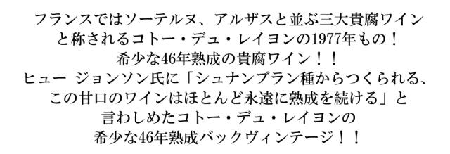フランスではソーテルヌ、アルザスと並ぶ三大貴腐ワインと称されるコトー・デュ・レイヨンの1977年もの!希少な46年熟成の貴腐ワイン!!ヒュー ジョンソン氏に「シュナンブラン種からつくられる、この甘口のワインはほとんど永遠に熟成を続ける」と言わしめたコトー・デュ・レイヨンの希少な46年熟成バックヴィンテージ!!■さまざまなギフトアイテムをご用意しております。お中元 ギフト 御中元 お盆 お礼 敬老の日 クリスマス 冬ギフト お歳暮 御歳暮 お年賀 御年賀 お正月 年末年始 ご挨拶 バレンタイン ホワイトデー お返し 父の日 母の日 ギフト 贈答品 お土産 手土産 御祝 御礼 内祝い 引き出物 お祝い 結婚祝い 結婚内祝い 出産祝い 出産内祝い 引き菓子 快気祝い 快気内祝い 進学祝い 誕生日祝い バースデーケーキ プレゼント Wedding ウェディング ホームパーティ お花見 パーティ 退職ギフト 退職 就任祝い