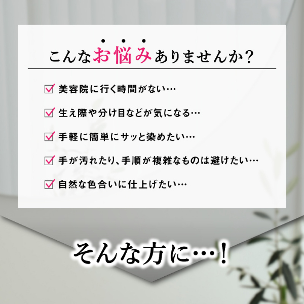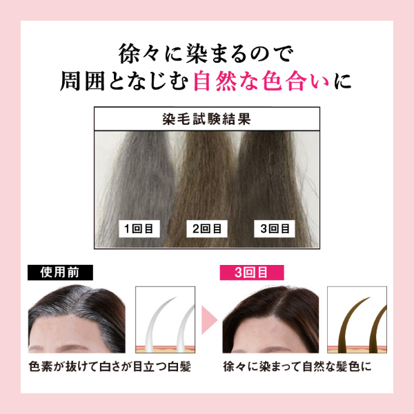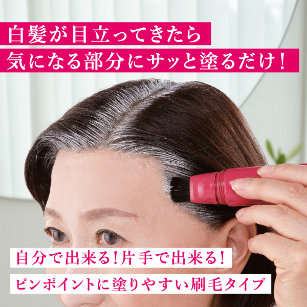 入浴5分前に塗るだけ!部分白髪染めにおすすめです。刷毛タイプでピンポイントに塗れ、回数を重ねるごとに徐々に染まるので、自然な仕上がりになります。【カラー】ダークブラウン、ライトブラウン