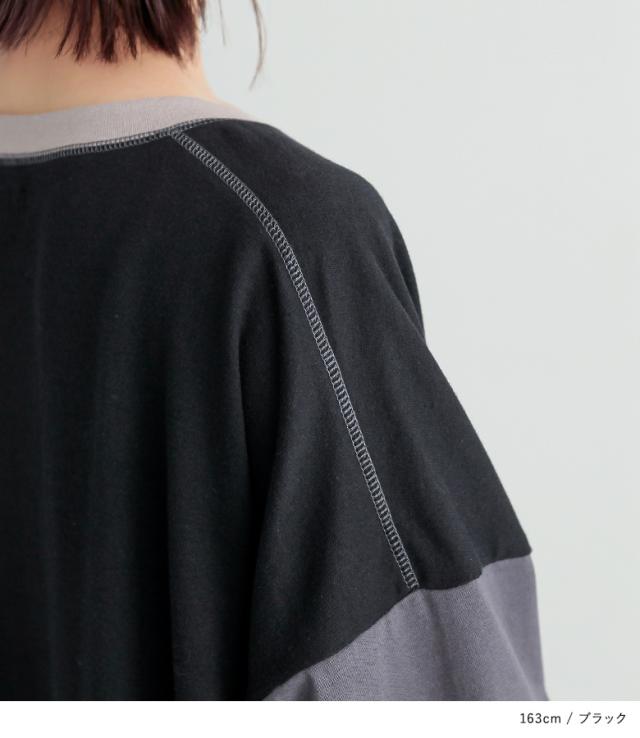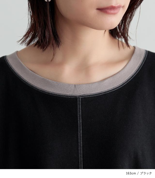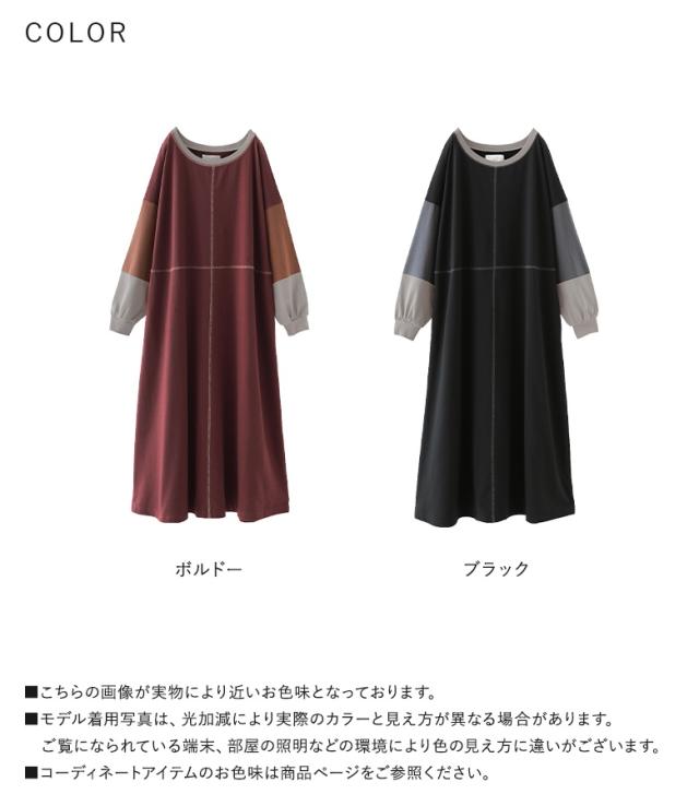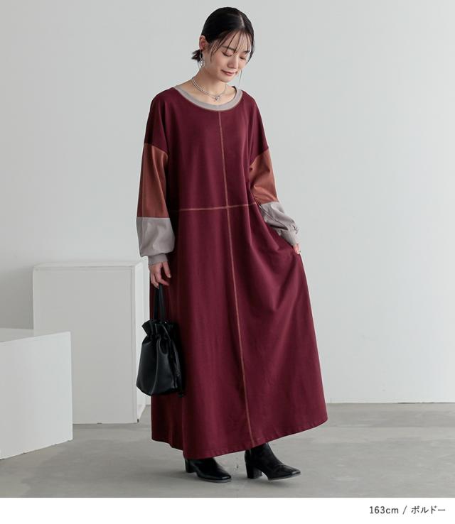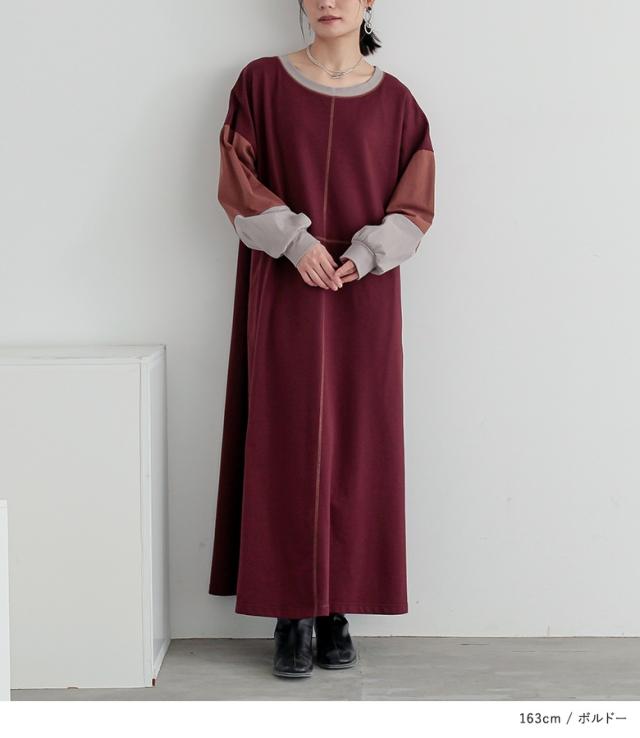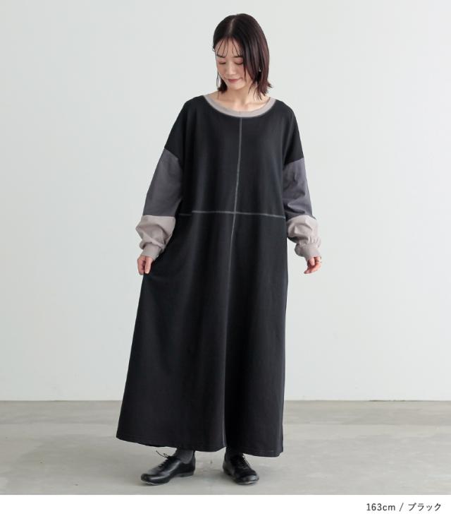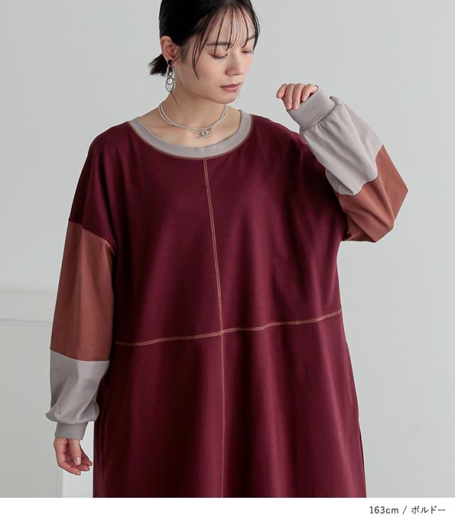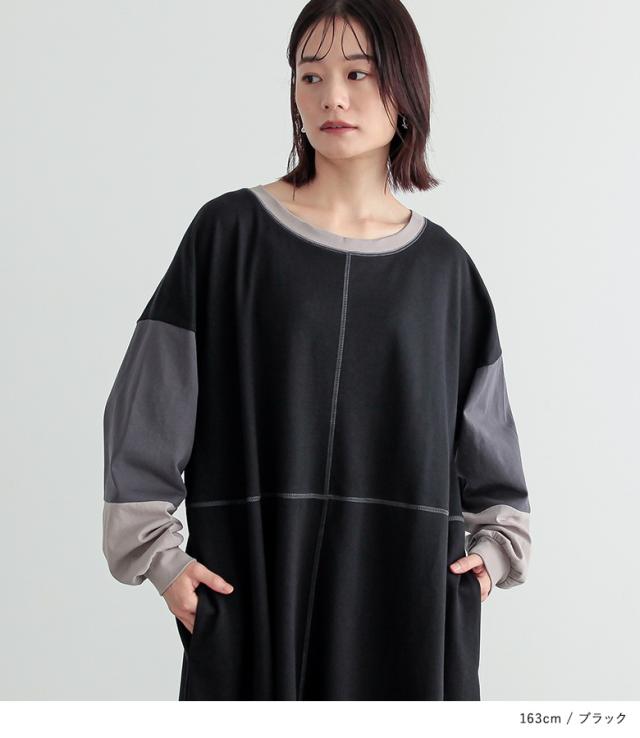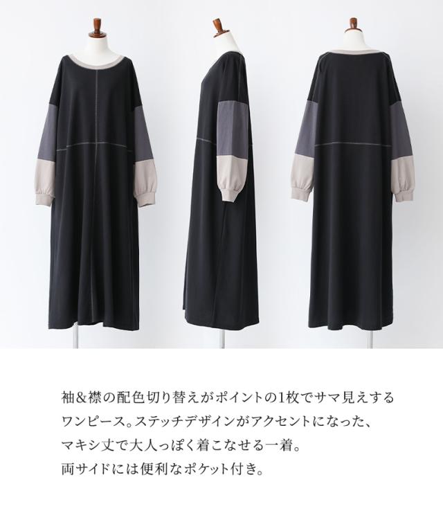 『配色切替デザインカットソーワンピース』【メール便不可】【20】[ロング ワンピース レディース 春秋冬 長袖 マキシ丈 ドロップショルダー 綿100% 綿混 Uネック 配色 ステッチ ポケット 裏毛 天竺素材]