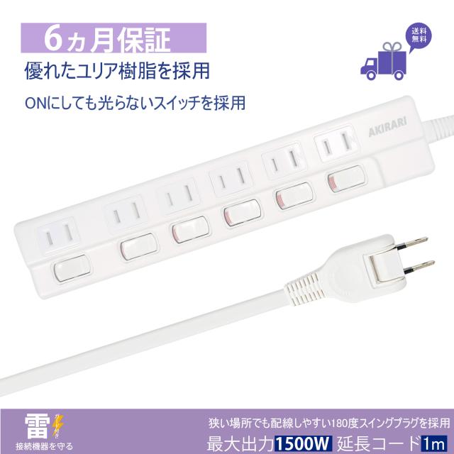 【ポイント10倍!!!】【プレゼントあり!!!】電源タップ タコ足配線 1500W 光らない 雷ガード 個別スイッチ スイングプラグ 6個口 ホワイト 6ヵ月保証 1m コンセントタップ ACコンセント 節電タップ 防雷 延長コード 省エネ iPhone/スマートフォン充電 おしゃれ 過熱保護