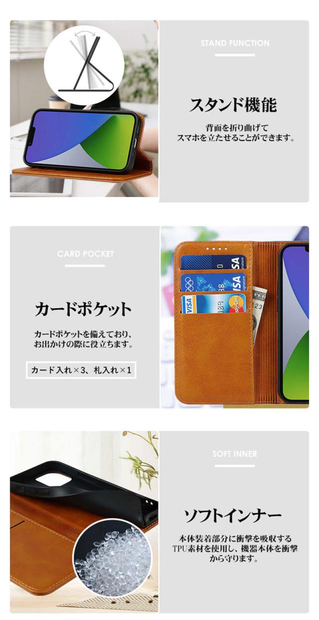 ※高品質のPUレザーと柔らかいTPU素材を採用しており柔軟性があるので、装着脱着時も携帯本体を傷からしっかり保護できます。