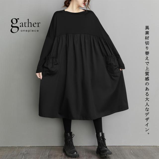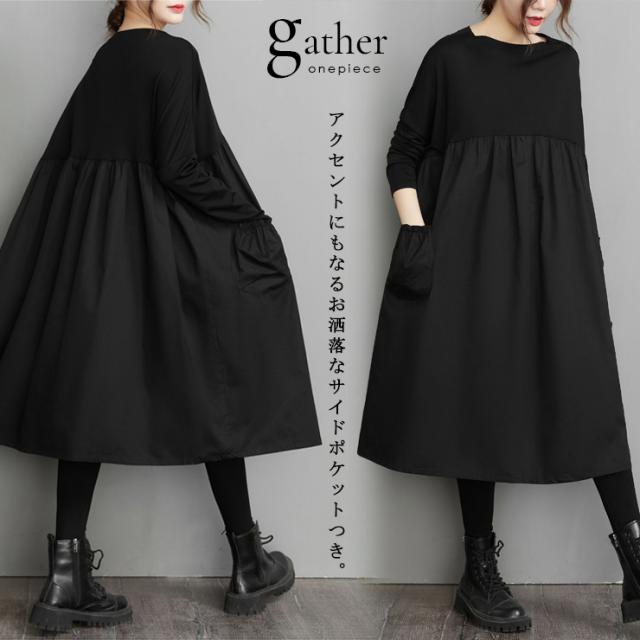 ギャザーワンピ 長袖 切り替えワンピース 黒 オーバーサイズ 春 秋 大きいサイズ レディース LL 3L 4L 5L 6L ブラック (116273)