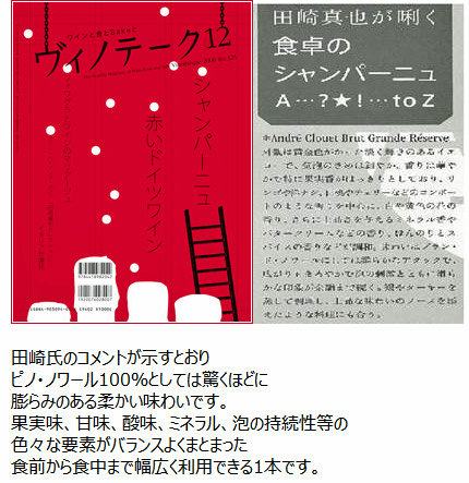 外観は黄金色がかった淡く輝きのあるイエローで気泡のきめは細やか。香りは華やかで特に果実香がはっきりとしておりリンゴや洋ナシ、白桃やチェリーなどのコンポートのような香りを中心に白や黄色の花の香り、さらに上品さを与えるミネラル香やバタークリームなどの香りほんのりとスパイスの香りなどが調和。味わいはブラン・ド・ノワールにしては柔らかなアタックで広がりもまろやかで泡の刺激とともに滑らかな印象が余韻まで続く。 (ヴィノテークNo.325より抜粋)