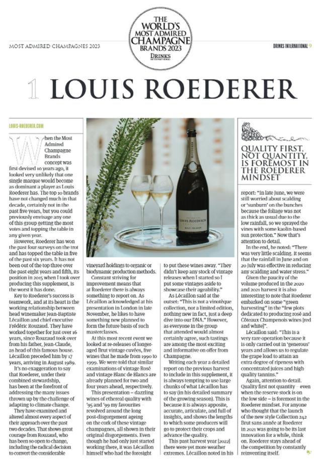 英国のアルコール飲料専門誌ドリンクス・インターナショナルの「世界で最も称賛されるシャンパーニュ・ブランド2023」にて、4年連続で第1位に選出されたシャンパーニュ・メゾン!!