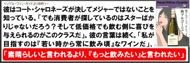 「ブルゴーニュ・シャルドネ」は、平均樹齢40年のコート・シャロネーズのジヴリ、リュリー、メルキュレイ等のシャルドネから。熟した柑橘系を思わせる香りでフレッシュ感とまろやかな香りが共存。酸味の筋が1本とおっていて軽やか、且つしなやか。フレッシュで若々しい洋梨や柑橘系フルーツを頬張った時の様な、溢れ出す芳香と果実味が魅力的である。とてもナチュラルで軽やかな、柔らかい味わい。充分なボリュームと満足感を感じる。