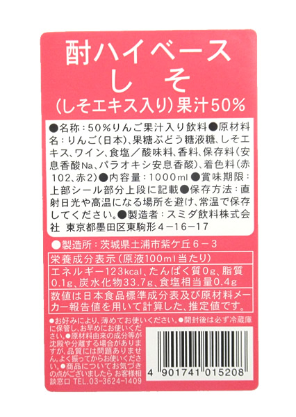 りんご(日本)、果糖ぶどう糖液糖、しそエキス、ワイン、食塩/酸味料、香料、保存料(安息香酸Na、パラオキシ安息香酸)、着色料(赤102、赤2)