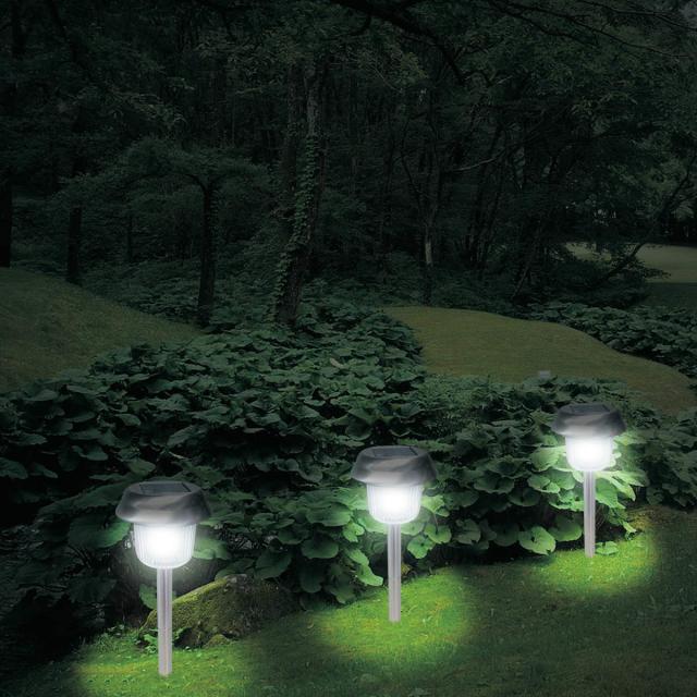 ステンレス製のガーデンライトです。昼間はソーラーパネルで充電し、暗くなったら自動点灯するので、配線の手間が省け、さらに電気代もかかりません。