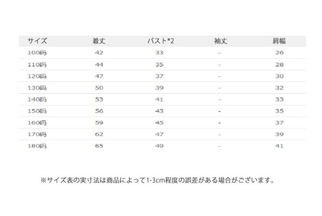 | サイズについての説明 | サイズ 着丈 バスト*2 袖丈 肩幅 ※サイズ表の実寸法は商品によって1-3cm程度の誤差がある場合がございます。 |