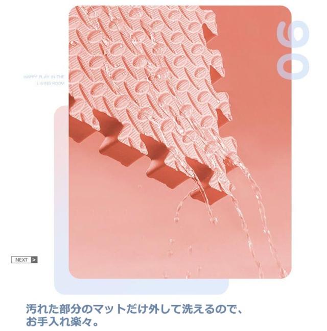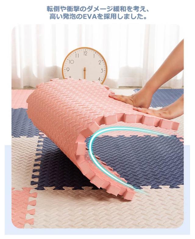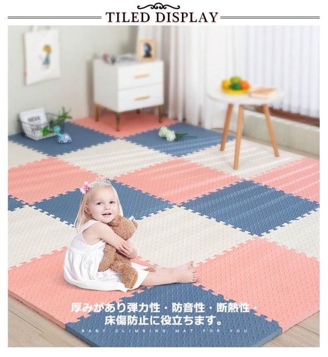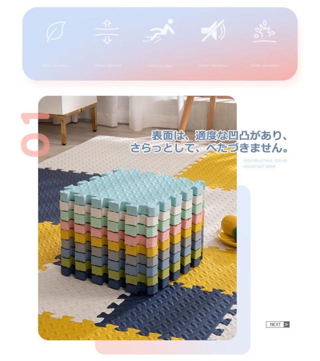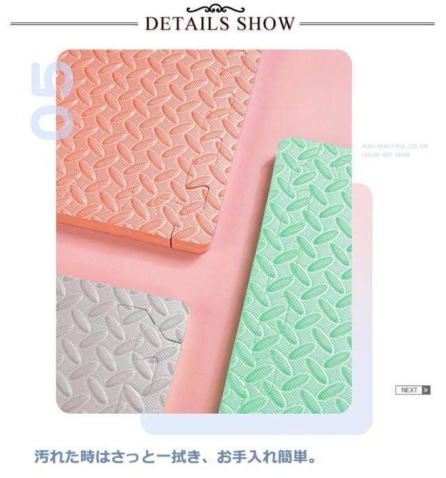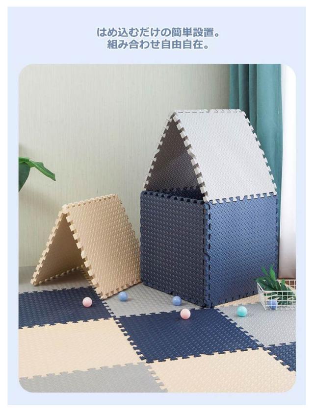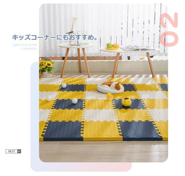 | ・アレンジ自由!床面保護や足音を吸収してくれる役割を果たします。 ・厚みがあり弾力性・防音性・断熱性・床傷防止に役立ちます。 ・キッズコーナーにもおすすめ。 ・表面は、適度な凹凸があり、さらっとして、べたづきません。 ・転倒や衝撃のダメージ緩和を考え、高い発泡のEVAを採用しました。 ・しっかりとした弾力で、お子様の足音や、振動などの気になる生活音をしっかりと吸収・軽減して騒音を抑えてくれます。 ・はめ込むだけの簡単設置。組み合わせ自由自在。 ・汚れた時はさっと一拭き、お手入れ簡単。 ・汚れた部分のマットだけ外して洗えるので、お手入れ楽々。 | |