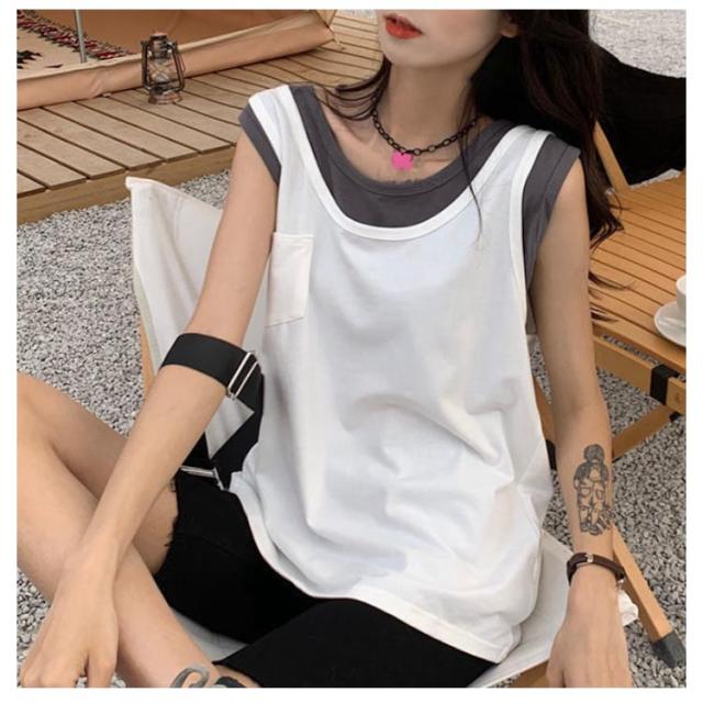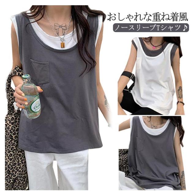 タンクトップ ノースリーブ 重ね着風 トップス カットソー カジュアル レディース tシャツ レイヤード 体型カバー 無地 ゆったり スポーツ 送料無料 ノースリーブ