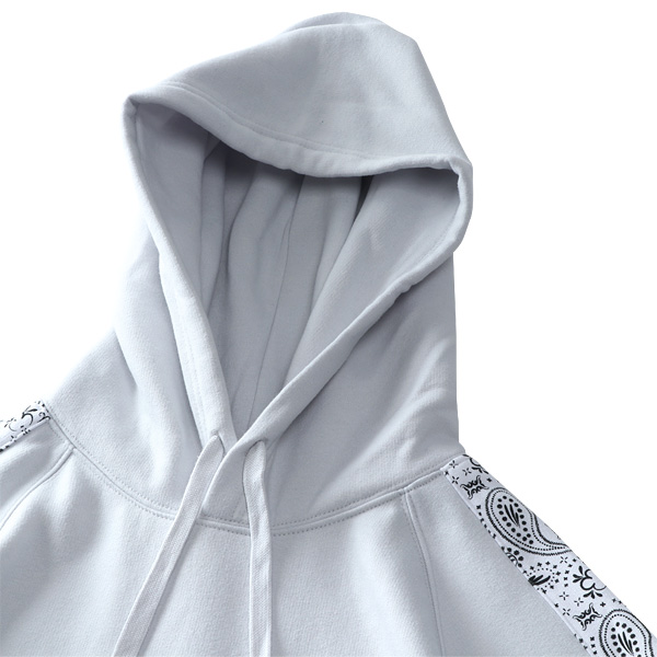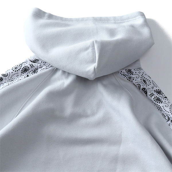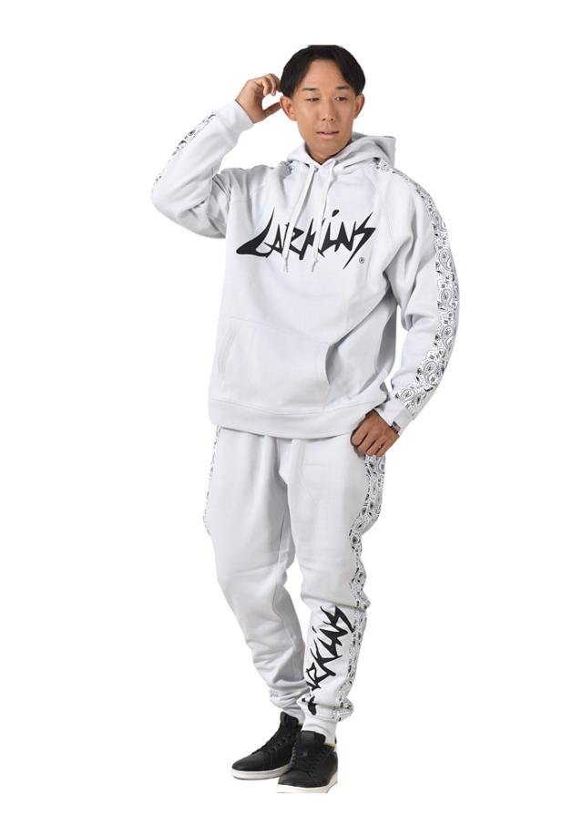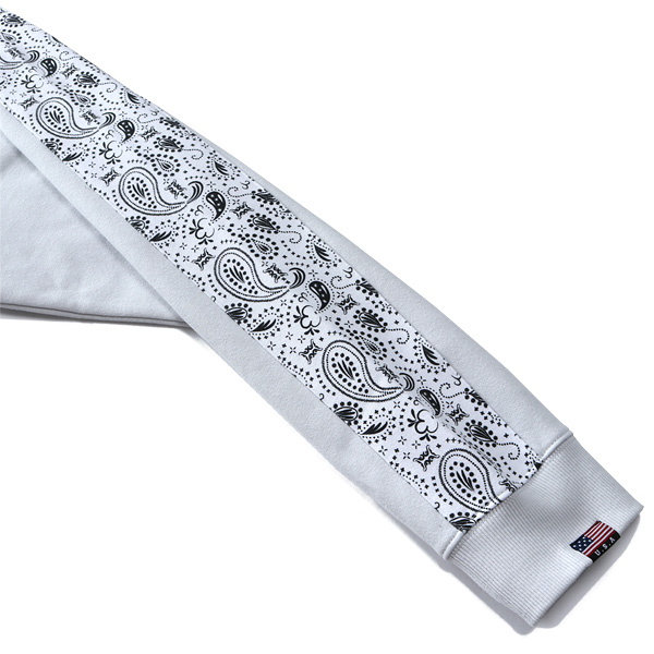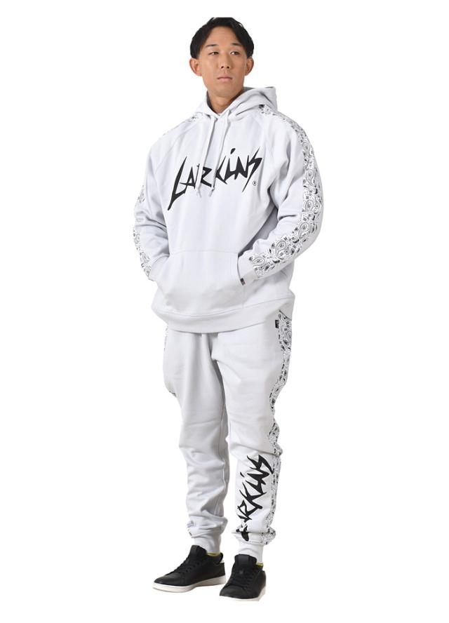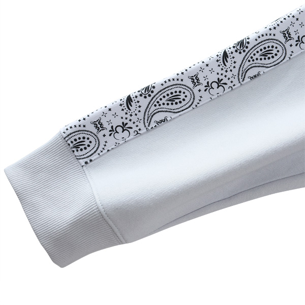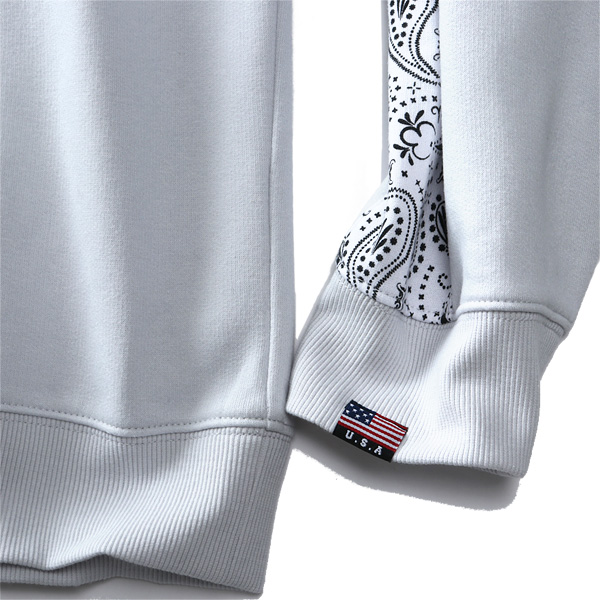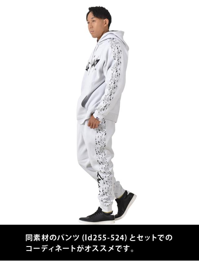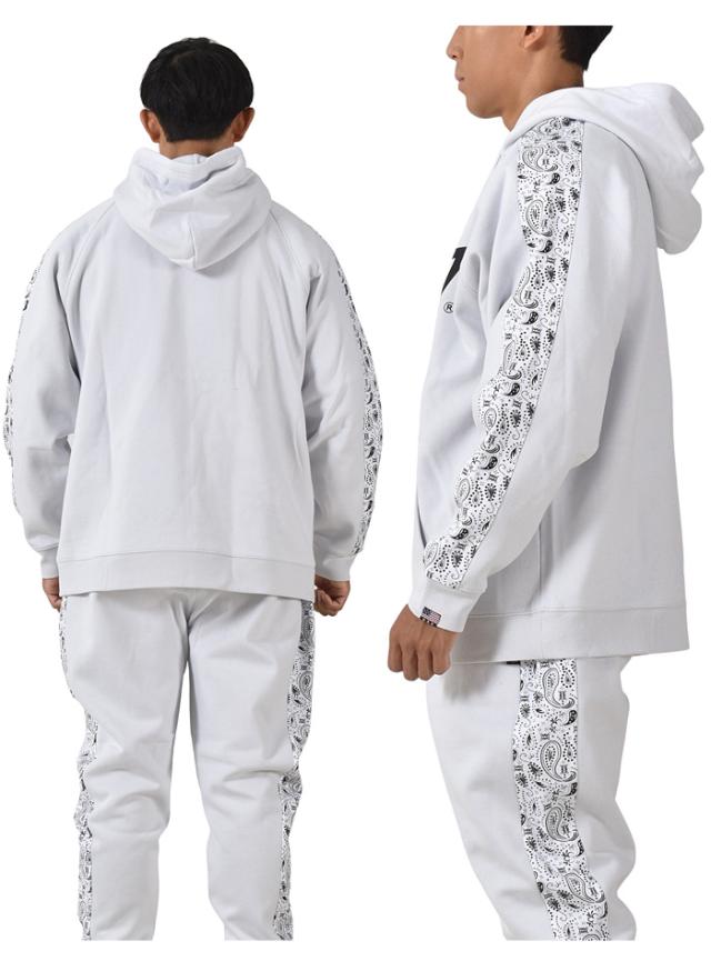 胸のブランドロゴがアクセントになっています。ボトムとのセットアップが出来るペイズリー柄のサイドラインが特徴です。ハーフジップスウェットとあわせて3点セットで着回し可能です。