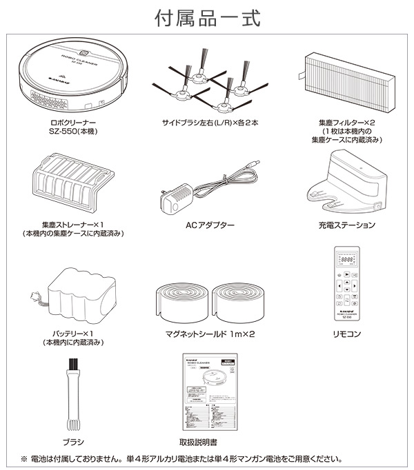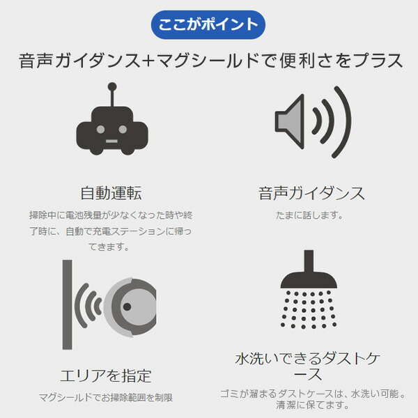 | 商品説明 | ●充電池:ニッケル水素Ni-MH 14.4V 2,000mAh ●ACアダプター定格:(入力)交流100V 50/60Hz(出力)直流24V 600mA ●稼動時間:最大約90分 ●稼動面積:約76.2平方メートル(47畳相当) ●使用環境:0℃〜40℃ ●付属品:サイドブラシ(左右)、集塵フィルター、ACアダプター、充電ステーション、マグネットシールド×2、ブラシ、リモコン、取扱説明書 ●おしゃれなスタイルで機能もバツグン ●自動運転:掃除の開始〜充電までおまかせ 開始時間を設定することでお好みのタイミングで自動スタートすることができます。オート走行モードでは、ジグザグ→スポット→壁沿い→ジグザグ→スポット→壁沿いを反復し、壁や家具などの障害物がある場合はその壁や家具に沿って動きながら2つのサイドブラシでごみや塵をかき出し、部屋全体を掃除します。掃除が終了した時と充電池残量が少なくなった場合、本体は自動的に充電ステーションに戻り充電を行い、次のお掃除に備えます ●音声ガイダンス機能搭載:「お掃除を開始します」など状況に応じたガイダンスが流れます ●付属のマグシールドで範囲制限:キッチン周りや赤ちゃんが寝ている場所など入ってきてほしくないエリアを、付属のマグネットシールドを使うことで制限できます ●水洗いできるダストケース:汚れが気になりだしたら、サッと水洗い。いつでも清潔に使用できます ※こちらの商品は2023年9月に型番変更をしております 【変更点】型番:SZ-500→SZ-550 稼働時間:約60分→約90分 |
