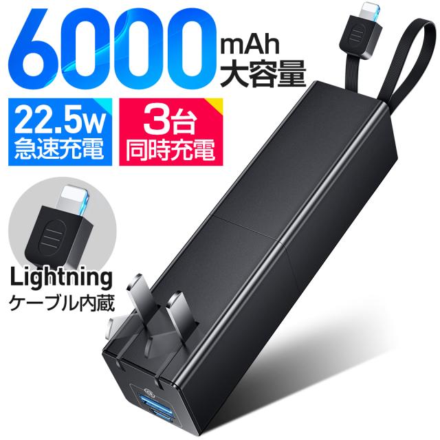 モバイルバッテリー 6000mAh 小型 大容量 軽量 充電器 3台同時充電 スマホ充電器 USB電源アダプター Lightningケーブル内蔵 携帯充電器 PD iPhone Android 対応