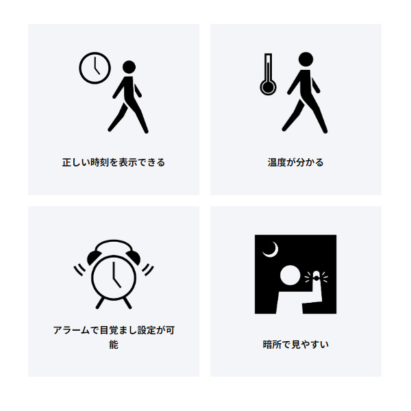 シンプルデザインで置き場所を選ばないデジタル表示の目覚まし時計です。 アラームをセットするとライトが点灯し続け※、暗所でも時刻が見やすい夜見えライト付きです。 また、生活環境お知らせ機能を搭載しており、健康管理にも役立ちます。 ※ アラーム(スヌーズ)をオンにするとアラーム設定時刻の8時間前から夜見えライトを開始します ■ケースサイズ(縦×横×厚さ) 90 × 150 × 45 mm ■質量 295 g ■カラー ブラック ■ケース材質 樹脂 ■時刻修正 電波時計 日本全国対応 ■使用電源・電池寿命 使用電池:アルカリ乾電池単3形×3 電池寿命:約1年 ■センサー機能 湿度計測機能(計測範囲=10〜90%、計測精度=±10%(5〜40℃)) 温度計測機能(計測範囲:0〜40℃、計測精度:±2℃(0〜40℃)) ※記載は商品仕様の一部です。仕様説明不足等の理由での返品はできません。特に適合等は必ずご確認ください。