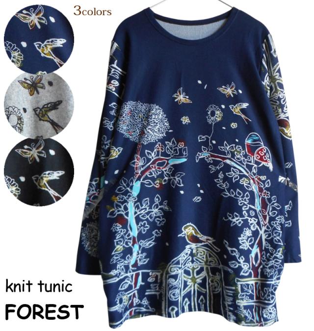 送料無料 チュニック ワンピース 長袖 薄手 ニットワンピース 鳥 ちょうちょ 森 フォレスト ガーデン 小鳥 ボタニカルナ チュラル 庭園 ネイビーグレー 黒 ロングトレーナー レトロ ゆったり 秋冬 かわいい 大きいサイズ 絵本 童話 森ガール ほっこり