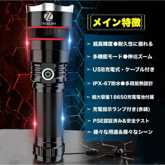 LED懐中電灯 超強力 超高輝度 ハンディライトUSB充電式 18650電池付き ズーム機能7モード SOS点滅 軍用 停電 防災 T6xCREE&cob IPX67防水 登山 夜釣り PSE認証済み