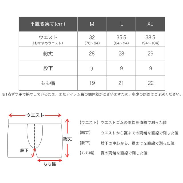 平置き実寸(cm)[ウエスト/総丈/股下/もも幅]:Mサイズ 32/28/9/19・Lサイズ 35.5/28/9/21・XLサイズ 38.5/29/9/22 ※多少の誤差はご了承ください