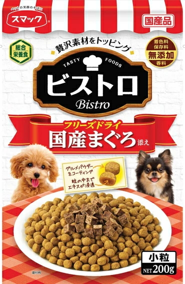 4970022014124国産フリーズドライまぐろトッピングがたっぷり入った贅沢なドライフードです。素材本来の旨味と栄養がそのままのフリーズドライ製法のトッピング。粒の中までエキスがギュッと浸透した、スマック独自のTaste in 製法とグルメパウダーでグルメな愛犬も大満足に仕上げました。小粒サイズで食べやすく無添加(着色料・保存料・香料)。植物発酵抽出エキスが腸内の善玉菌を増やし、腸内容物を分解することで便臭を抑えます。